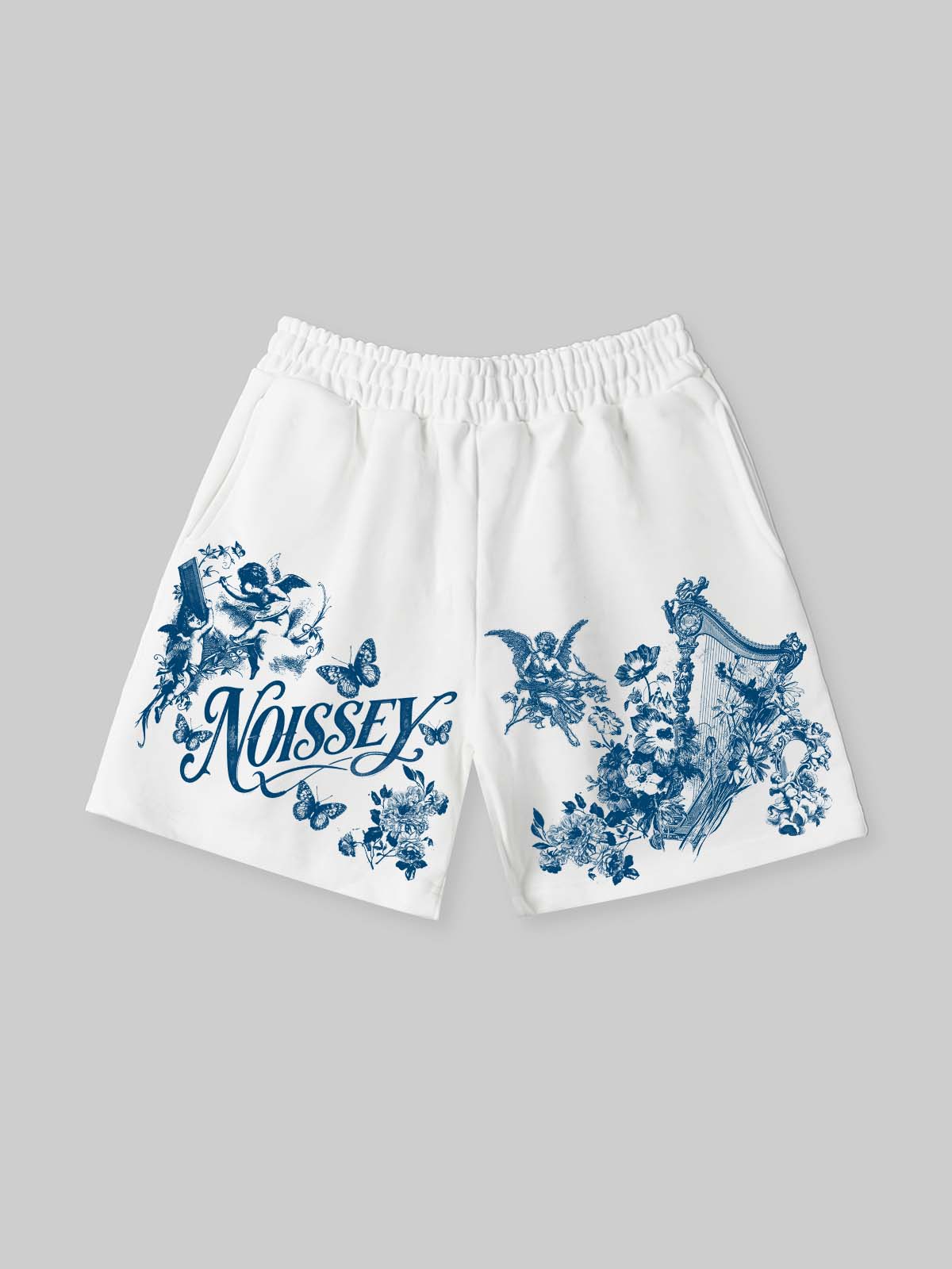 NOISSEY "Heavenly Garden" Blue Angel & Floral Art Print White Wide-Leg Shorts