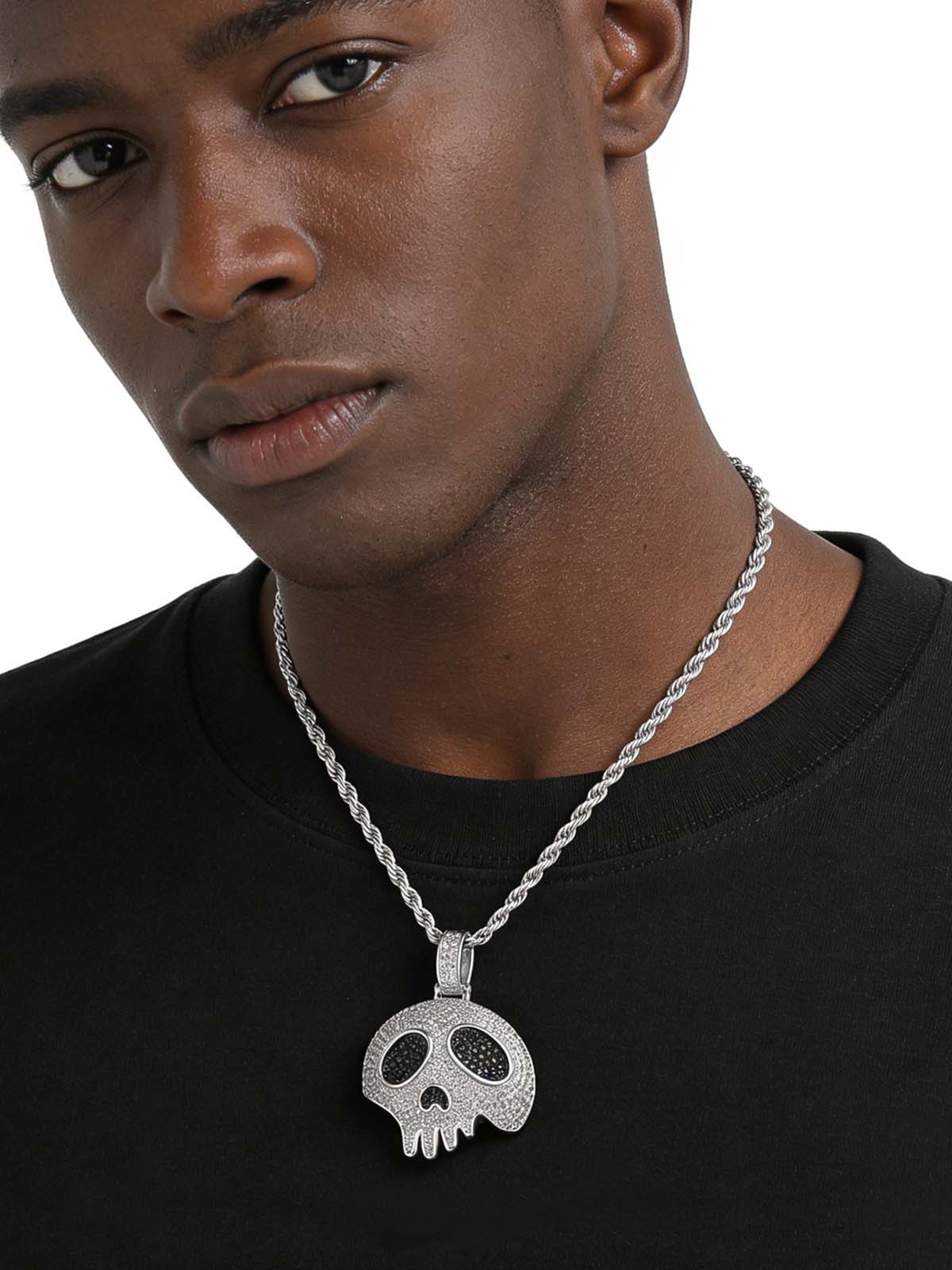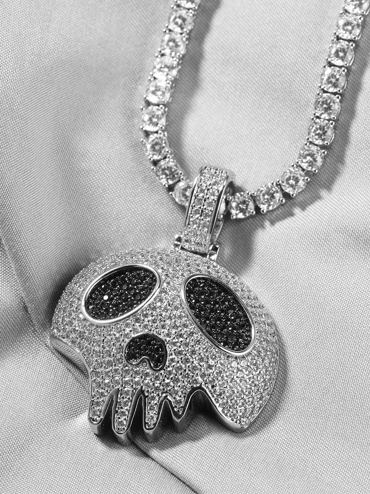 NOISSEY "Dripping Skull" Fully Iced-Out Black Zircon Pendant & Tennis Chain Necklace