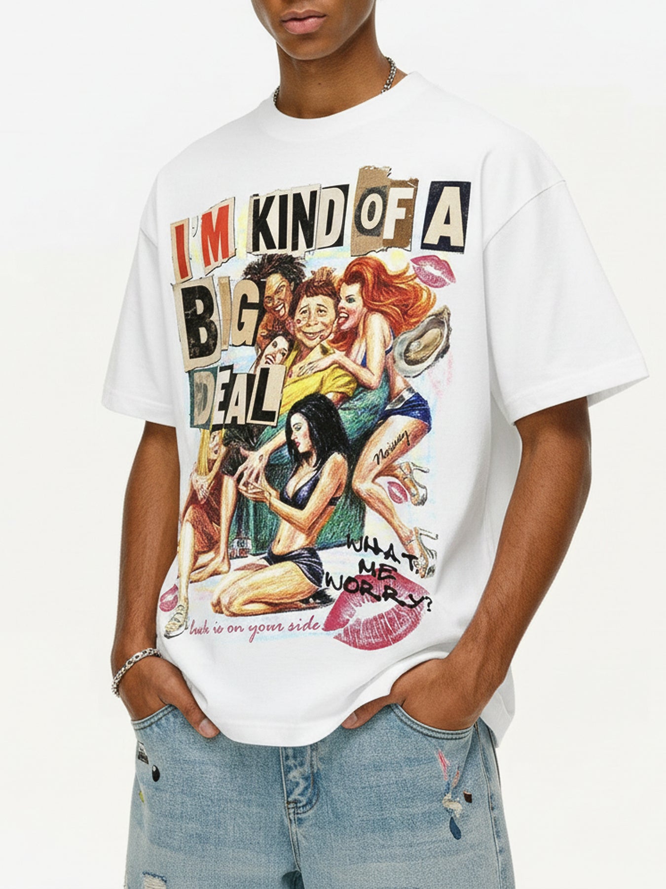 Mainstream irony meets underground grit. A high-octane manifesto of Y2K nostalgia and raw artistic expression, this tee features a multi-layered "BIG DEAL" collage graphic. Mimicking the texture of 90s tabloid satire and urban wheat-pasting, it is crafted for those who lean into the "ugly-cool" aesthetic with premium streetwear comfort.
