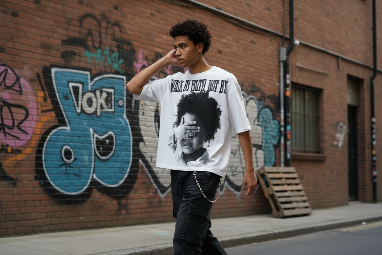 This T-shirt features a boxy fit—shorter in length, wider in cut, with longer sleeves. Perfect for a relaxed, street-style look.