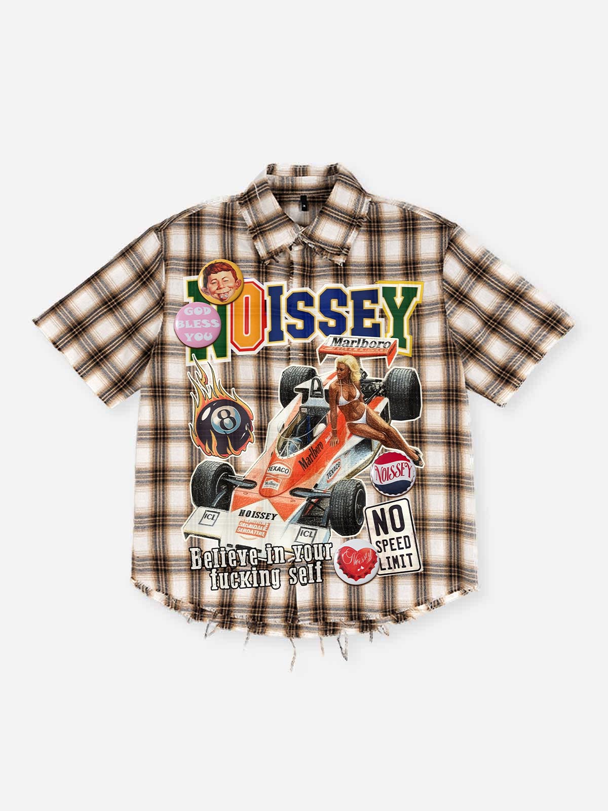 Front view of a brown checkered shirt with a large racing queen graffiti art print.