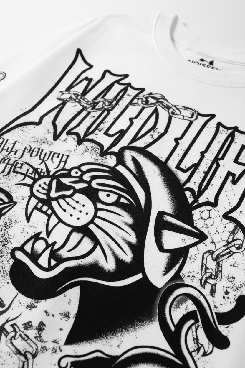 Size Recommendation: Take your standard size for the intended relaxed look. The clean white canvas makes the bold black-and-white tattoo motifs and the leopard-print sleeve details pop with high-contrast energy.