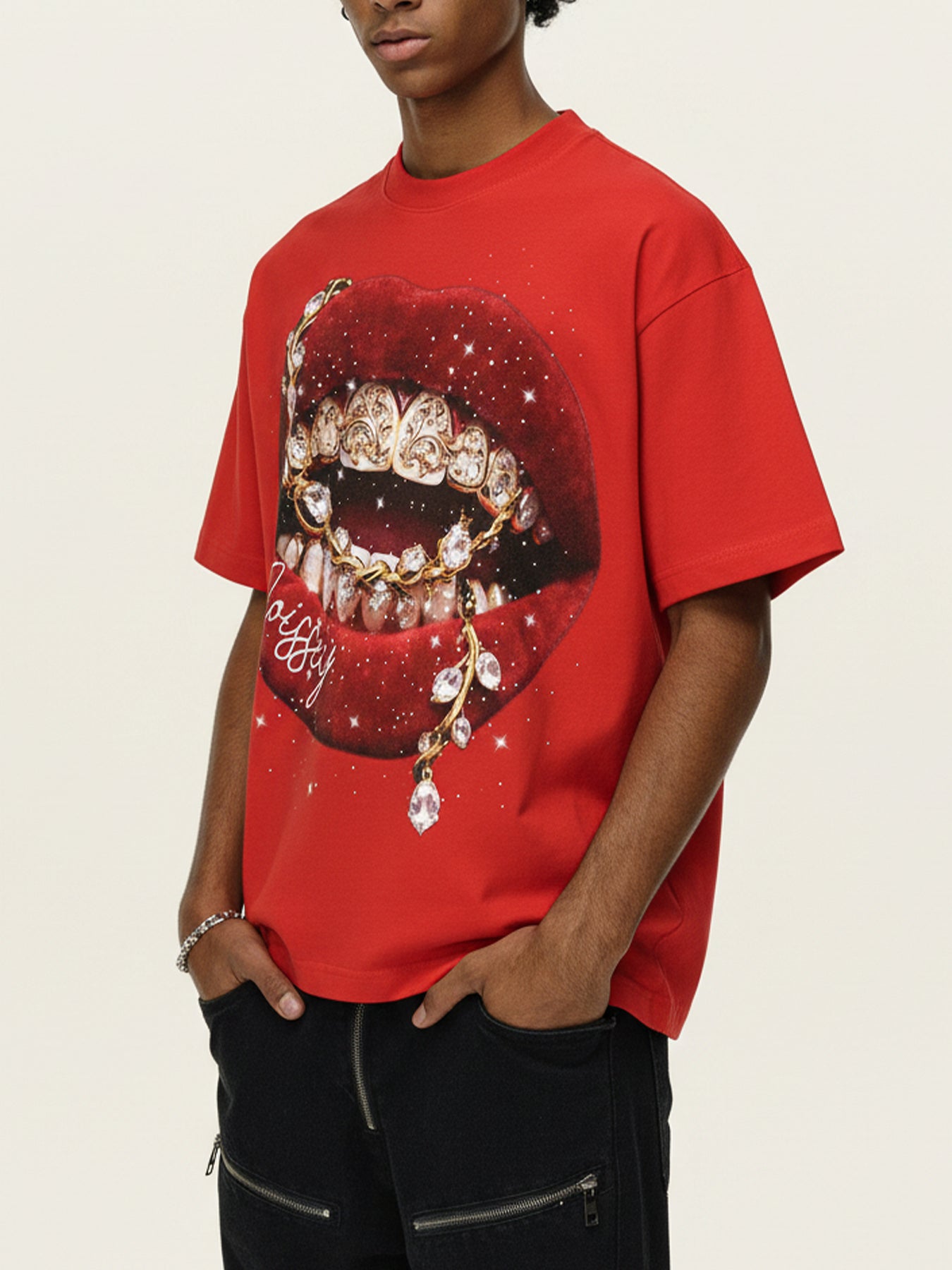 Front view of a red boxy oversized t-shirt featuring a large graphic of red lips with gold chains and sparkling rhinestones.