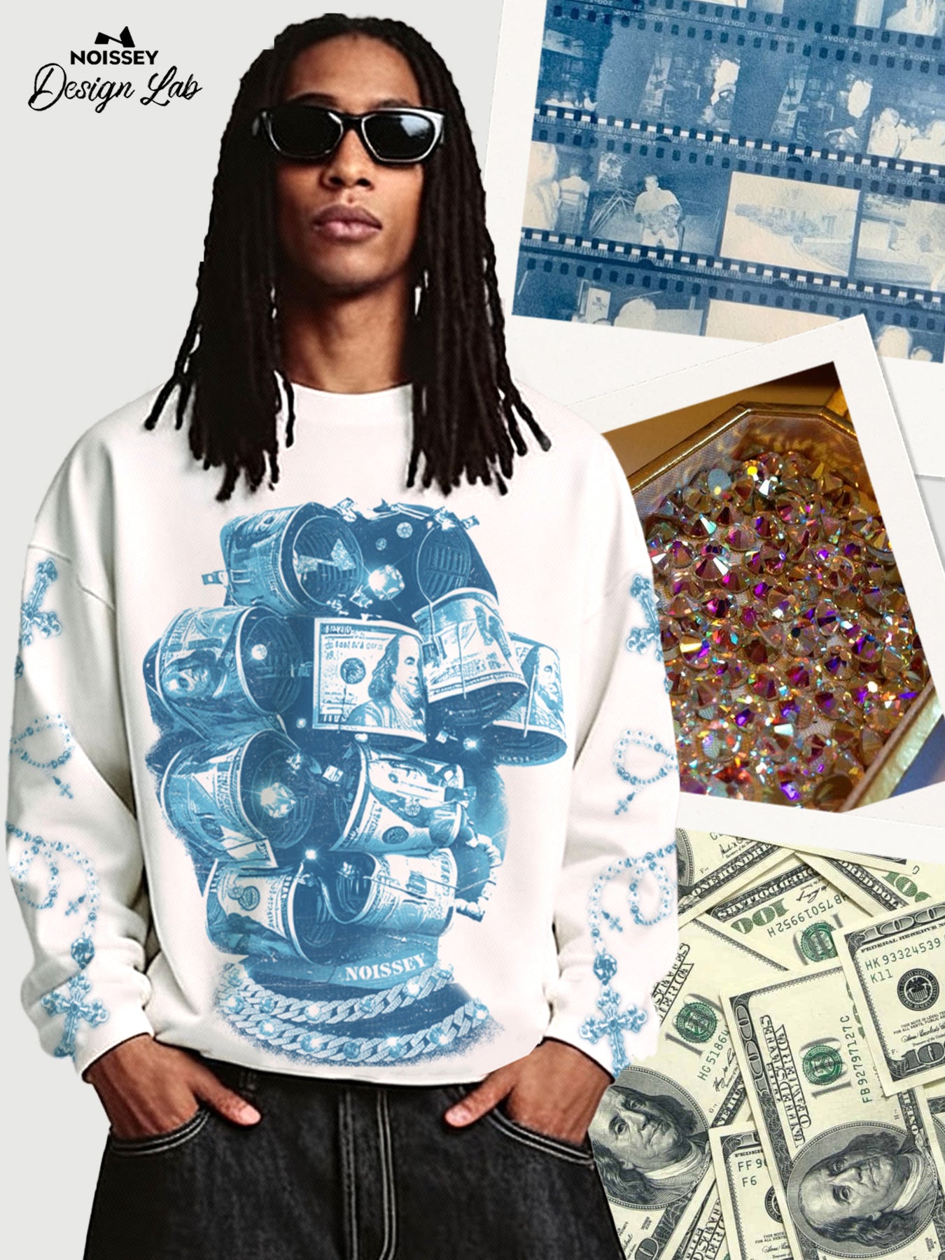 This long sleeve showcases a unique blueprint style, as if blending dreams into the garment. The air layer fabric is lightweight and breathable, like a cloud. Its design inspiration is as bold and novel as wrapping hair with money. Wear it and embark on a unique fashion journey.