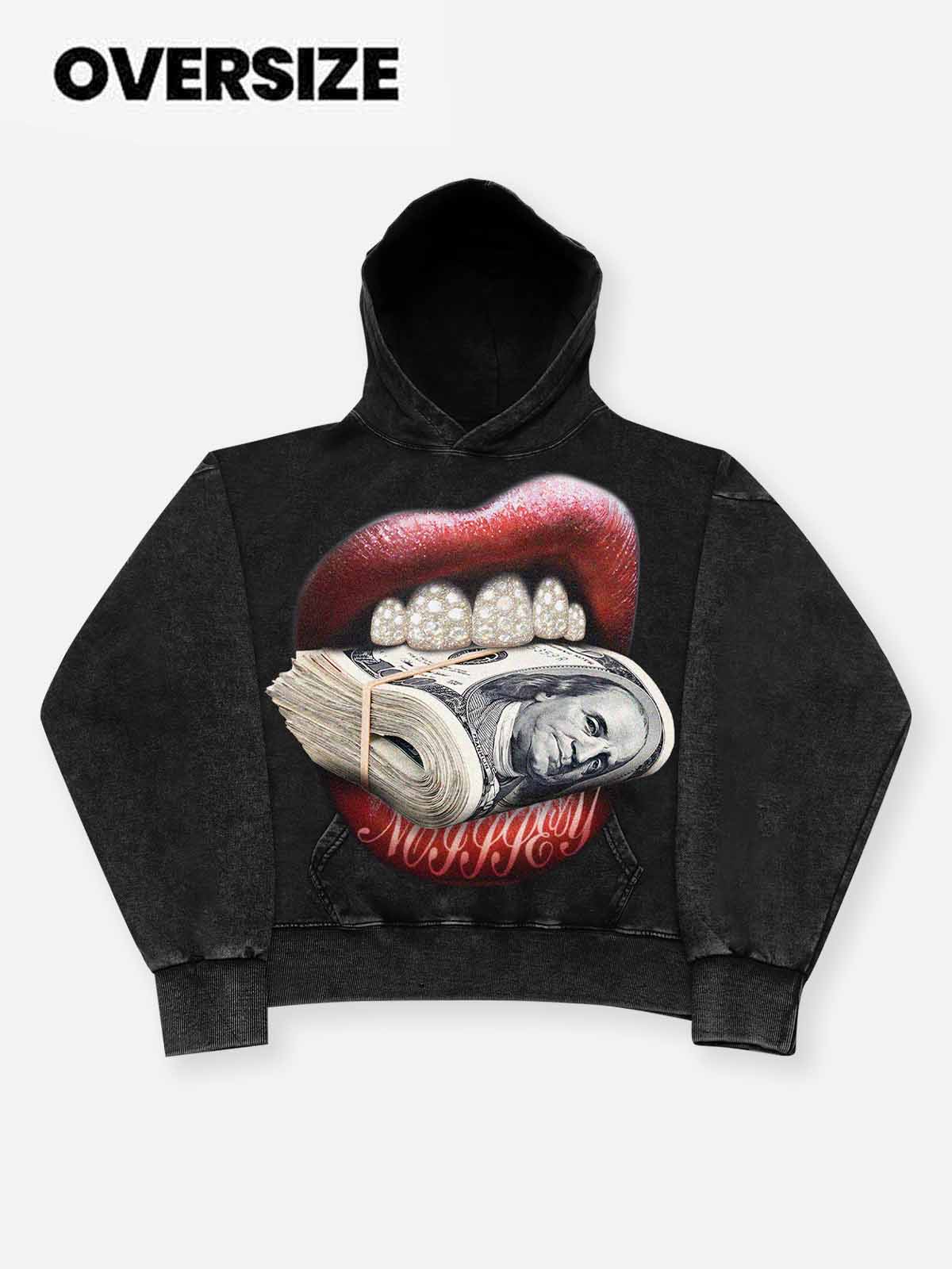 The Hook: Faith in the wild. Ambition in every bite. This hoodie features the provocative "Money Bite" graphic, centered around Iced Out Grills gripping a roll of cash. Designed with a heavy-duty boxy silhouette, it’s a high-stakes visual statement for those who hungry for success.