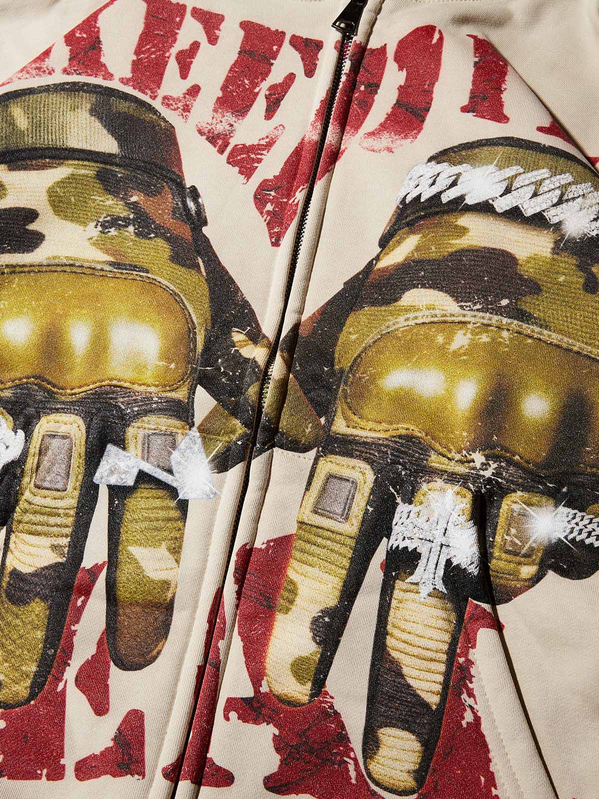 Military camouflage meets trendy hand gestures, full of personality. Comfy fabric, street style. Show your true self, a must-have for cool outings!