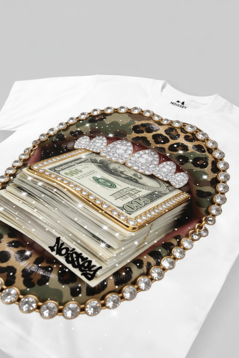 The Hook: Faith in the wild. Hustle in the jungle. This piece features a high-octane fusion of camouflage and leopard textures, centered by a provocative "Money Mouth" Grills graphic. Hand-applied DIY shimmering accents add a layer of raw luxury to this urban predator aesthetic.