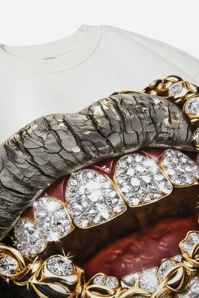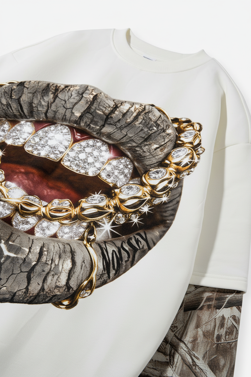 The Hook: Faith in the wild. Opulence in the nature. This standout long sleeve features a hyper-realistic "Iced Out" Grills graphic entwined with heavy golden chains, set against a clean cream base. The integrated tree-camouflage print on the sleeves adds a rugged, outdoor edge, merging forest textures with high-end urban luxury for a bold, singular look.