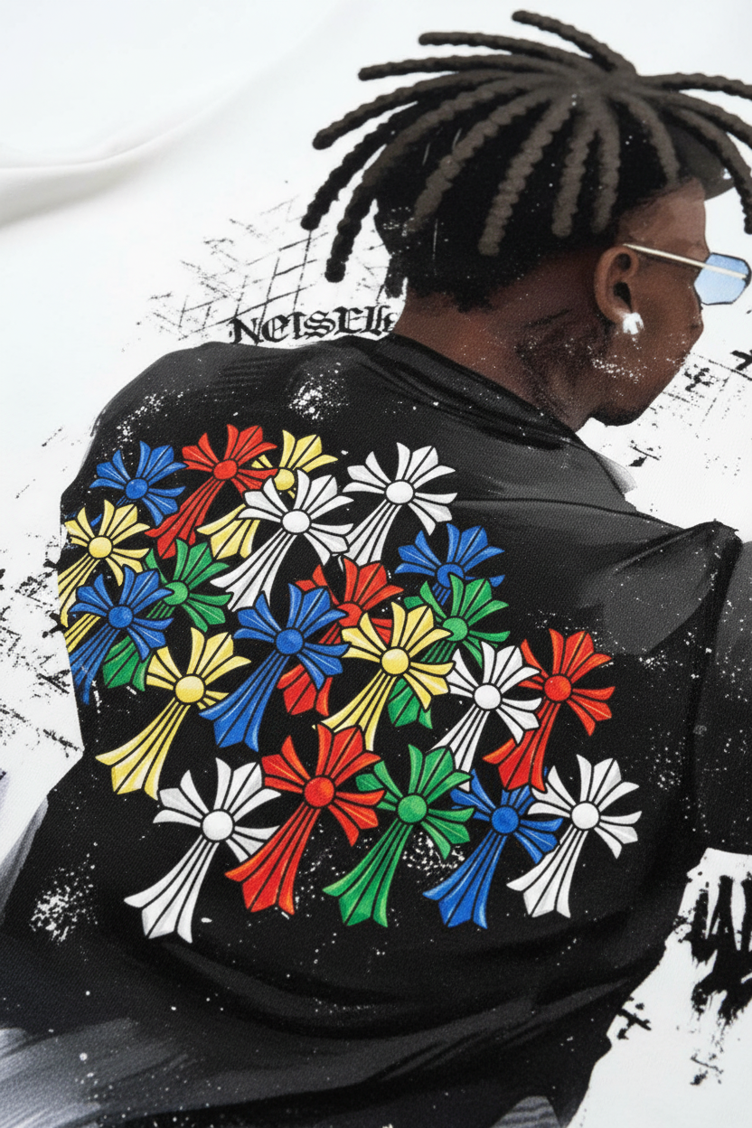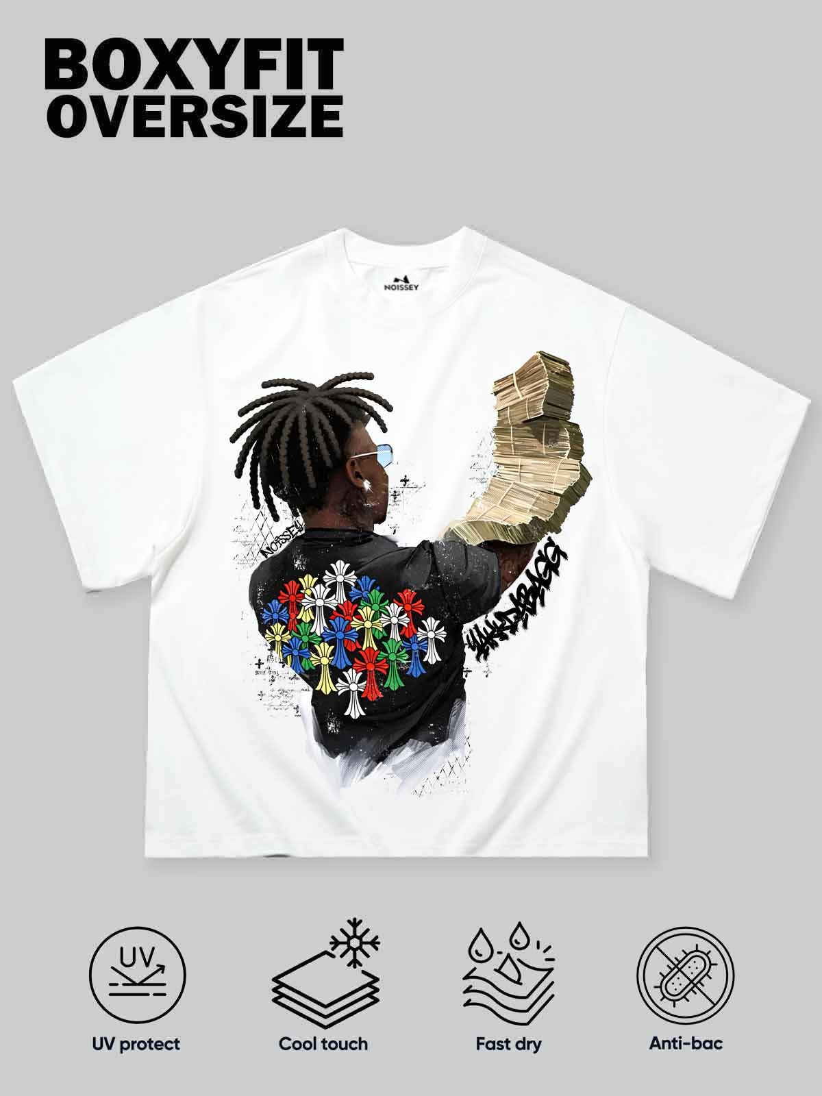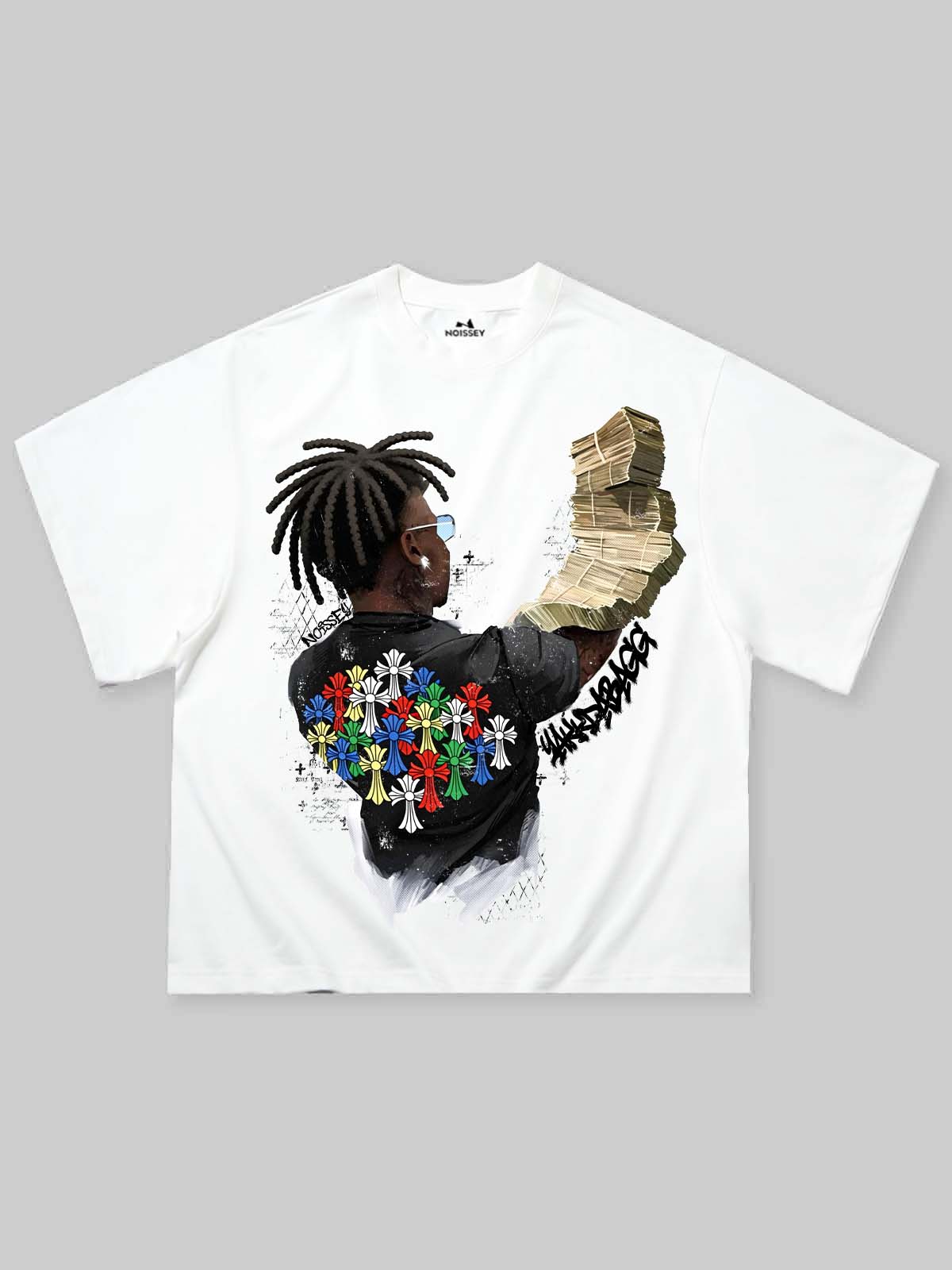 The Hook: Faith in the wild. Wealth in the vision. This striking piece captures the hustle with a high-definition graphic of a street-icon holding a massive stack of cash, accented by an array of vibrant, multicolor art crosses. The Boxy Fit provides a sharp, structured silhouette that perfectly frames this visual celebration of success and belief.