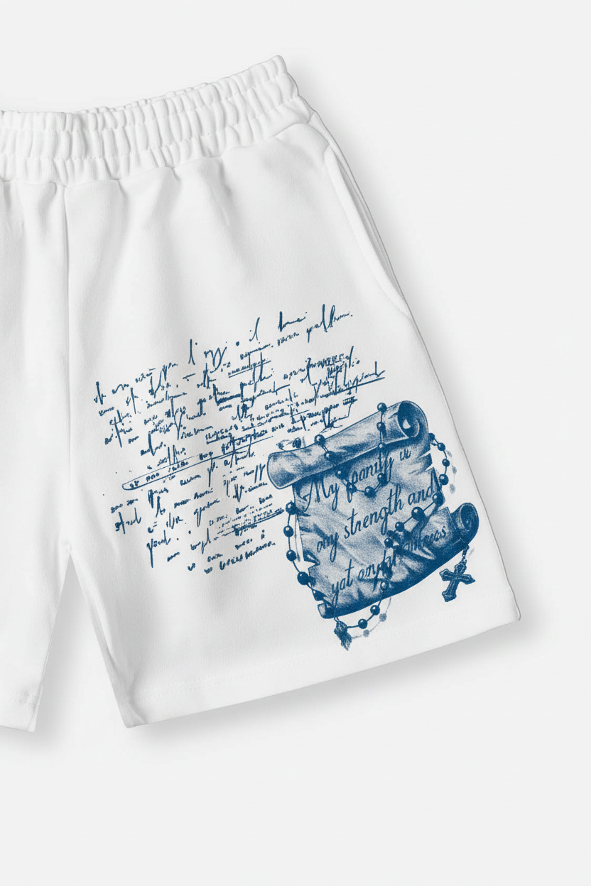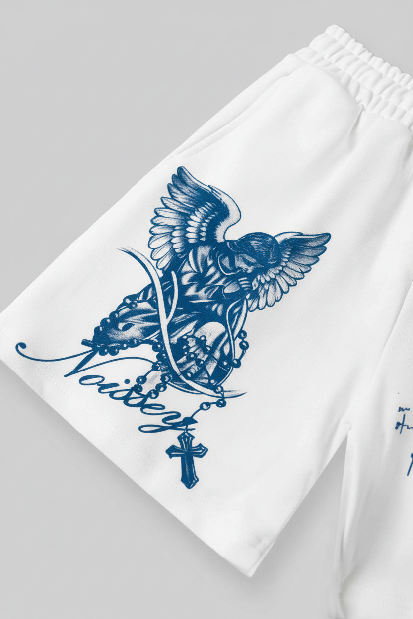 The Hook: A serene dialogue between classical art and modern streetwear. These premium white shorts feature a striking dual-graphic design: a detailed illustration of a praying angel on the right leg, and a poetic arrangement of blue script and ancient scrolls on the left. Rendered in a deep, melancholic Prussian Blue, the artwork transforms these casual shorts into a piece of wearable "Archival Art".