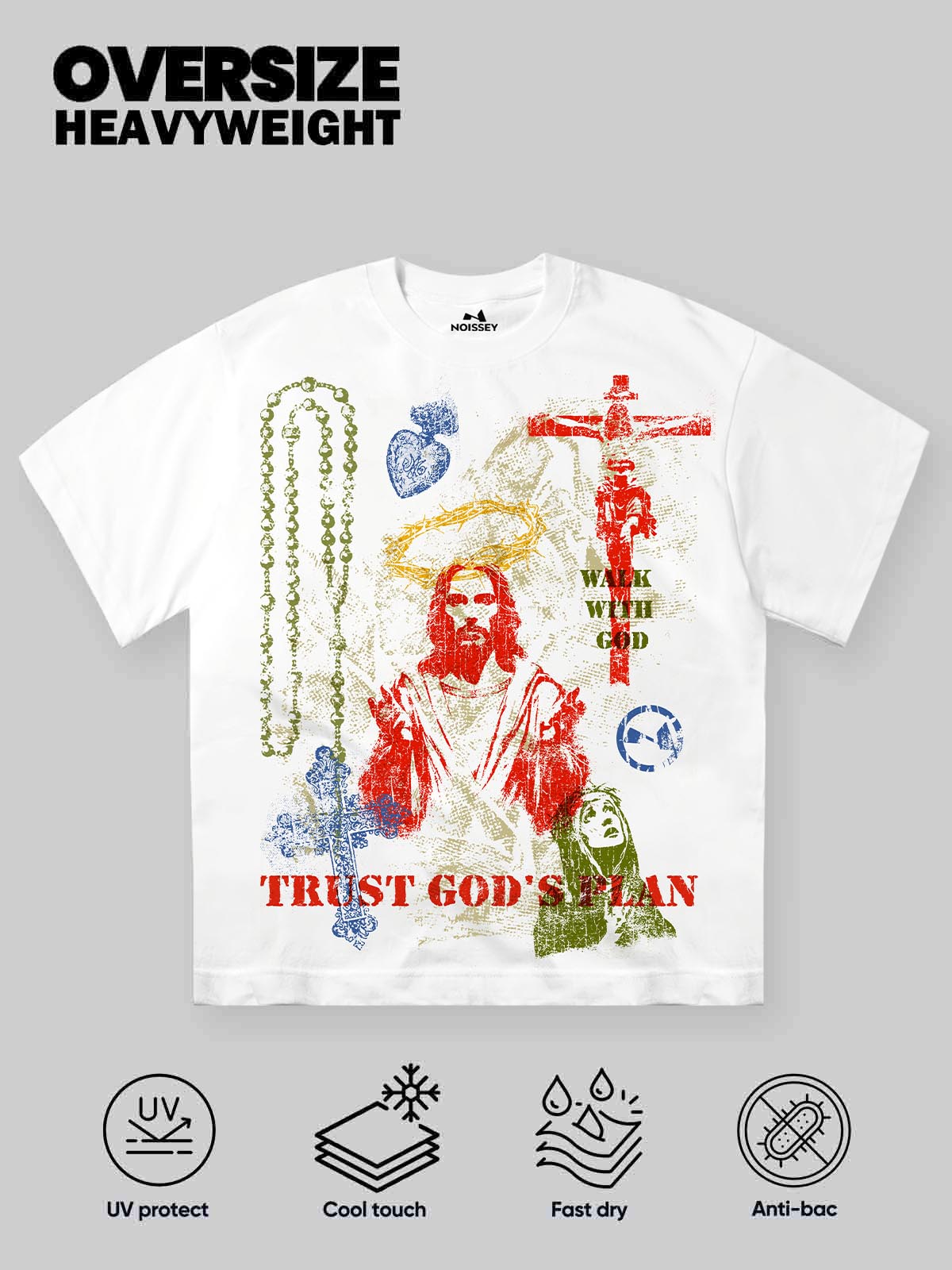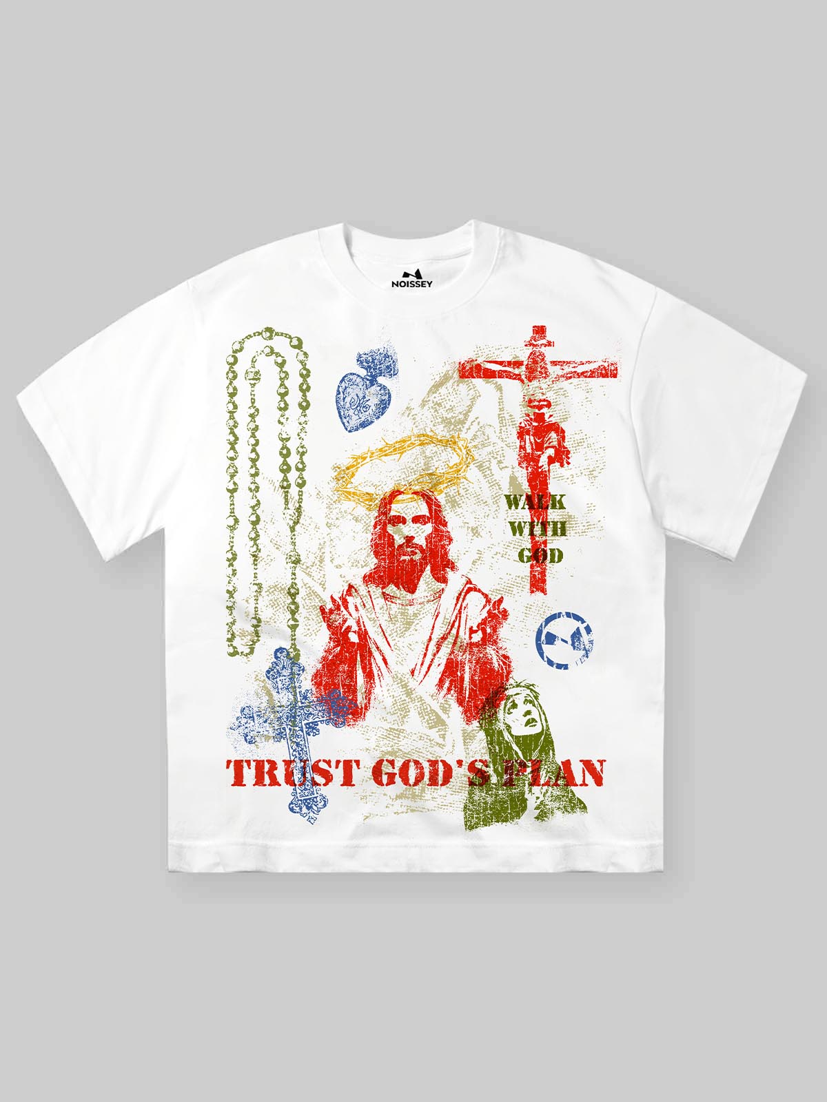 White T-shirt with colorful "Trust God's plan" screen print features vibrant colors and clear printing, simple yet powerful. Made of comfy fabric, perfect for daily wear.