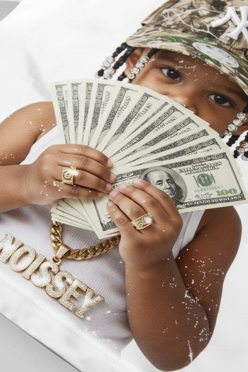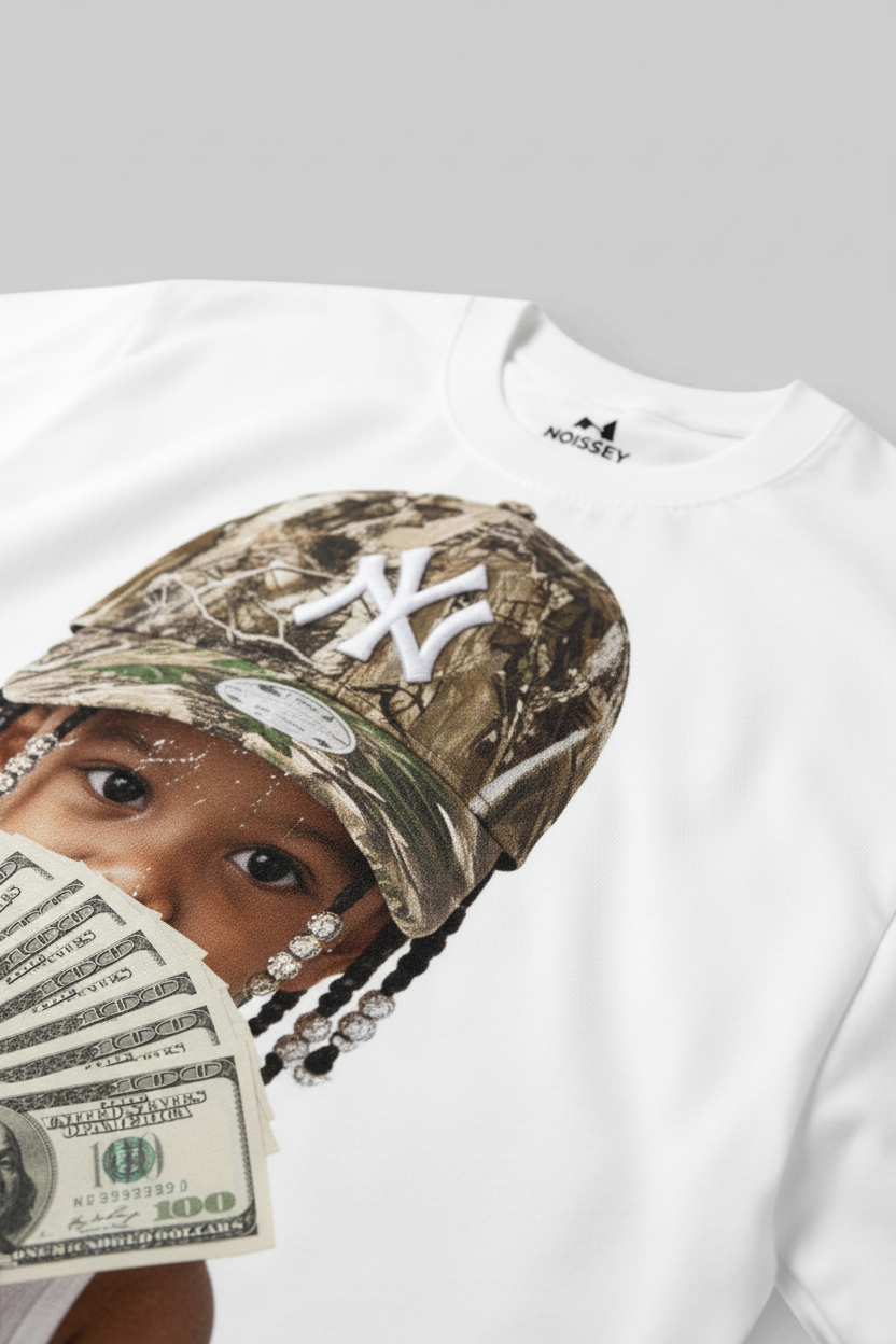 This T-shirt showcases a charming print of a little boy in a wood-grain pattern hat, holding money, exuding playfulness and a hint of fortune. Crafted from soft, breathable fabric, it promises all-day comfort. Elevate your casual style with this delightful piece!