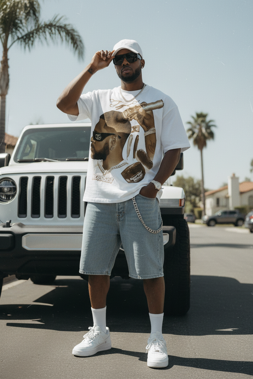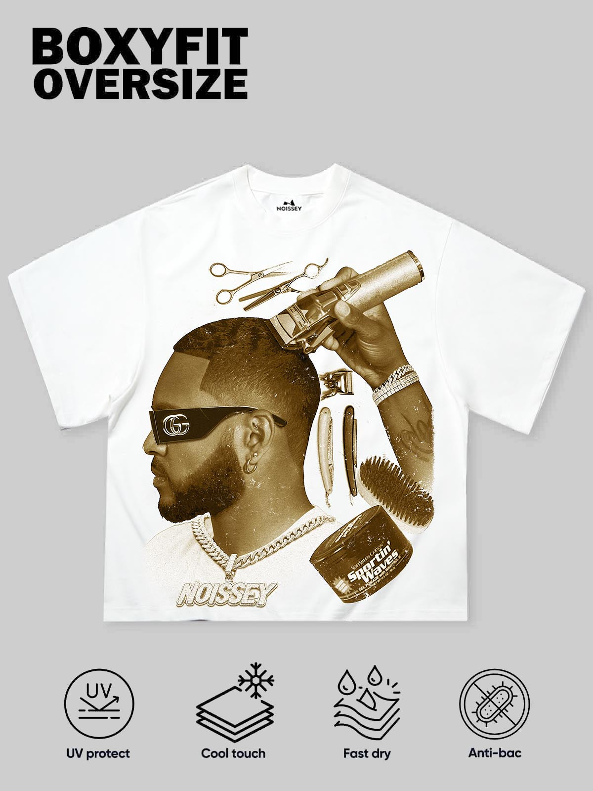 Barbershop Character Art Collage Poster Printed Boxy Oversized T-shirt, with a boxy fit featuring a shorter length, wider silhouette, and longer sleeves for a relaxed feel. The unique character art collage poster print is vintage and eye-catching, letting you effortlessly showcase your trendy attitude and become a street focal point!
