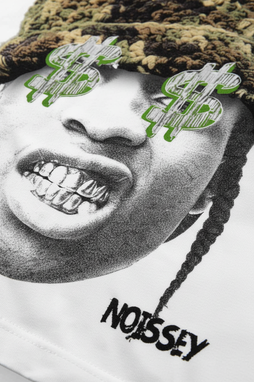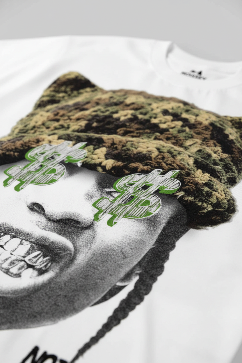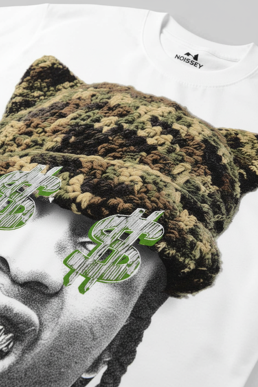 This T-shirt is super eye-catching! The camouflage cat-ear knitted hat pattern is cute, and with the unique character print, it's full of trendy vibes. The fabric is soft, comfy, breathable, and skin-friendly. Whether for daily outings or parties, it makes you the focus. Show your unique fashion sense. Get it now!