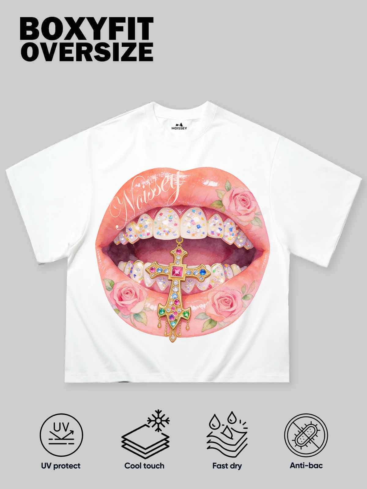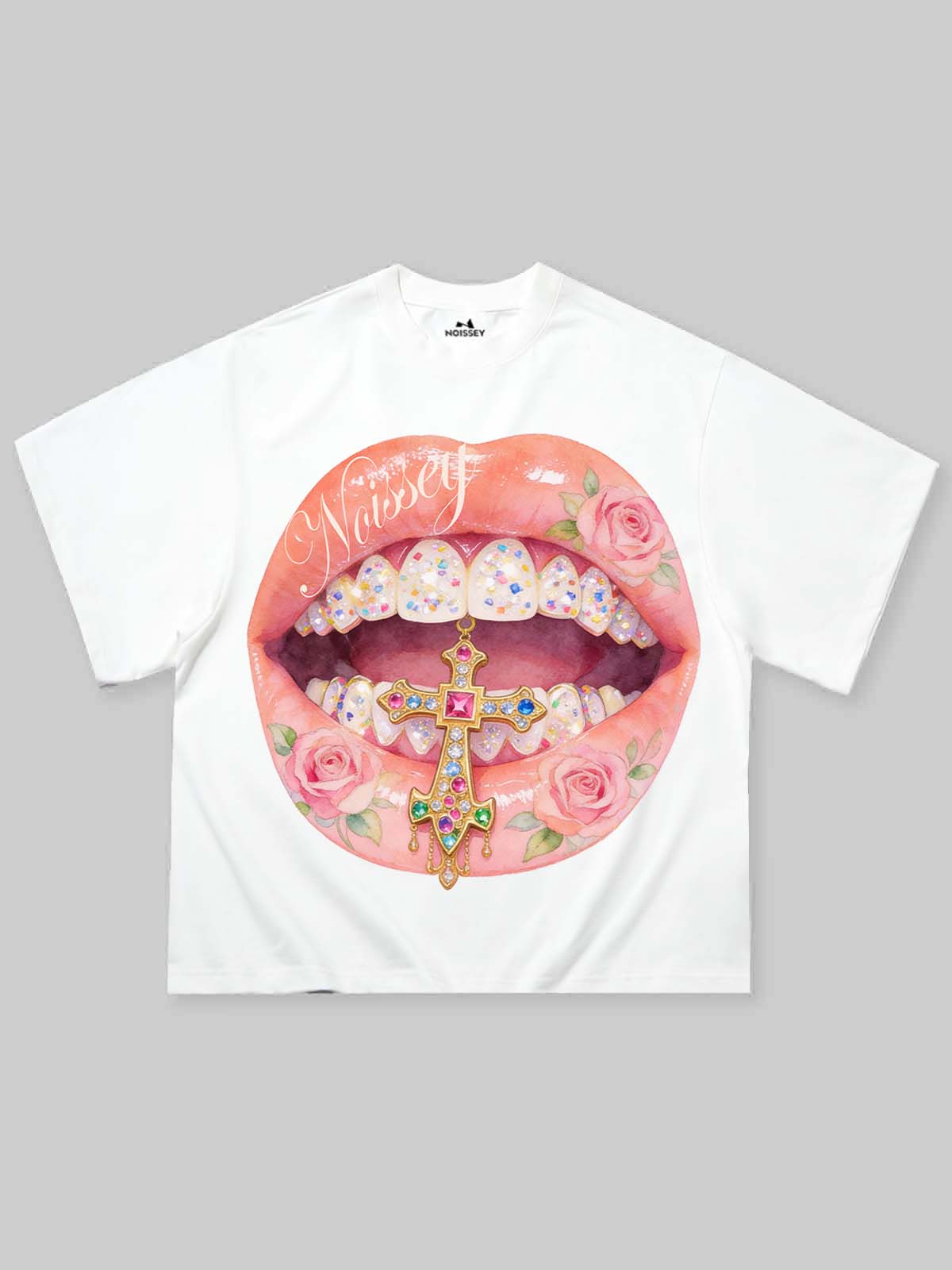 This T-shirt features a boxy fit—shorter, wider, and with longer sleeves—offering a relaxed yet stylish look. The unique cross, pink rose, and lip diamond art print makes it stand out. Show off your casual vibe and unique taste effortlessly. Don't miss it!
