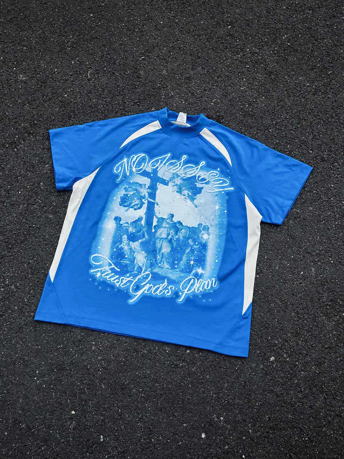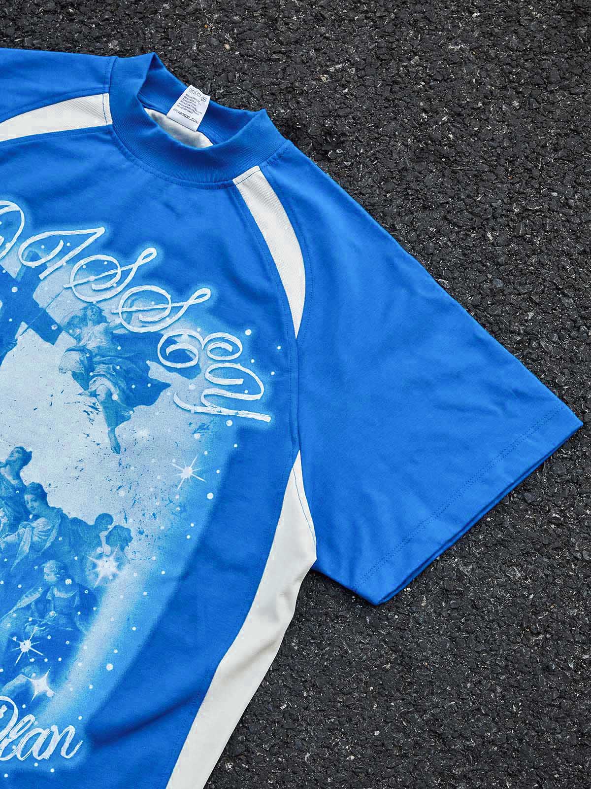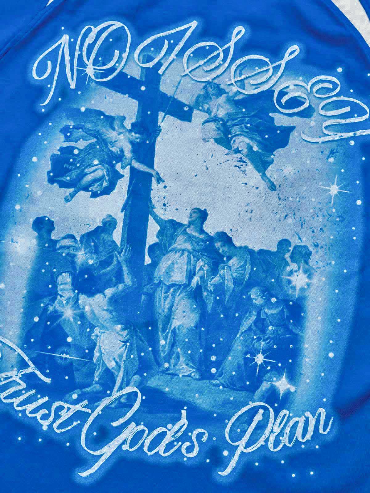 This Cyanotype-style religious shimmering art printed T-shirt is a unique blend of art and fashion. The intricate design showcases a religious-inspired pattern with a dazzling shimmer effect. Made from high-quality fabric, it's comfortable to wear. Stand out from the crowd with this eye-catching piece!