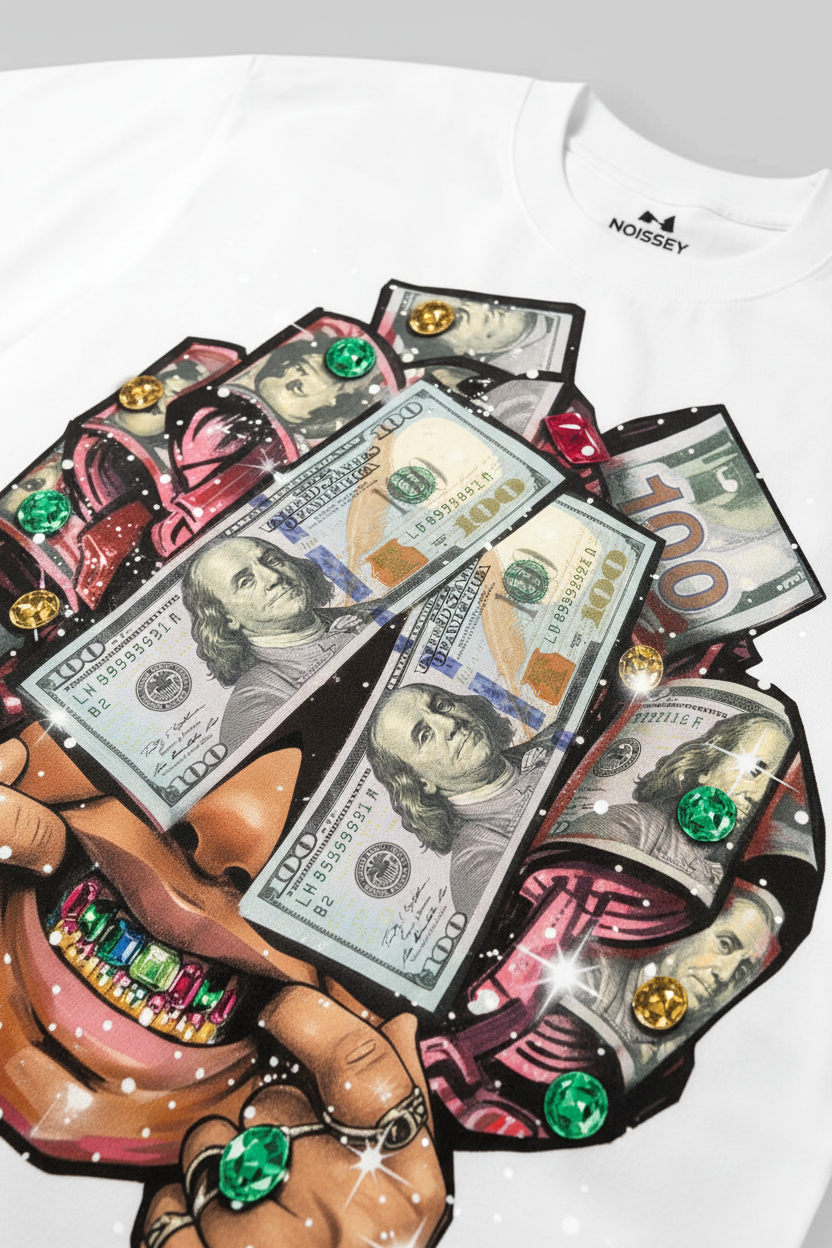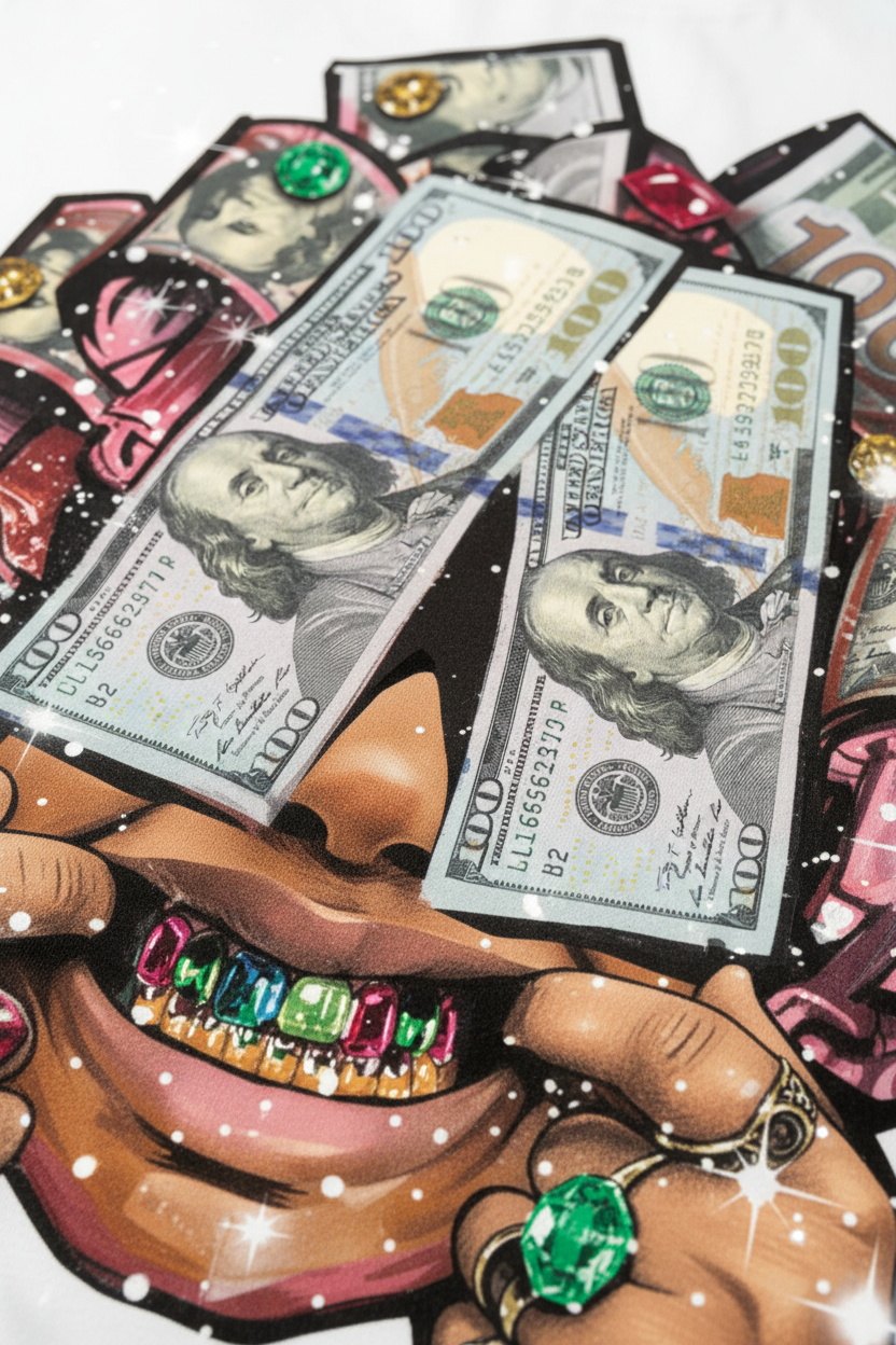 Turn heads with our Glitter Graffiti Money-Head Woman Art Print T-Shirt. This bold design features a creative DIY-style graphic of a woman adorned with $100 bills and shimmering jewels, accented with eye-catching glitter details. Made from high-quality, skin-friendly fabric, it offers a perfect blend of artistic rebellion and premium street fashion. Effortlessly cool and uniquely expressive.