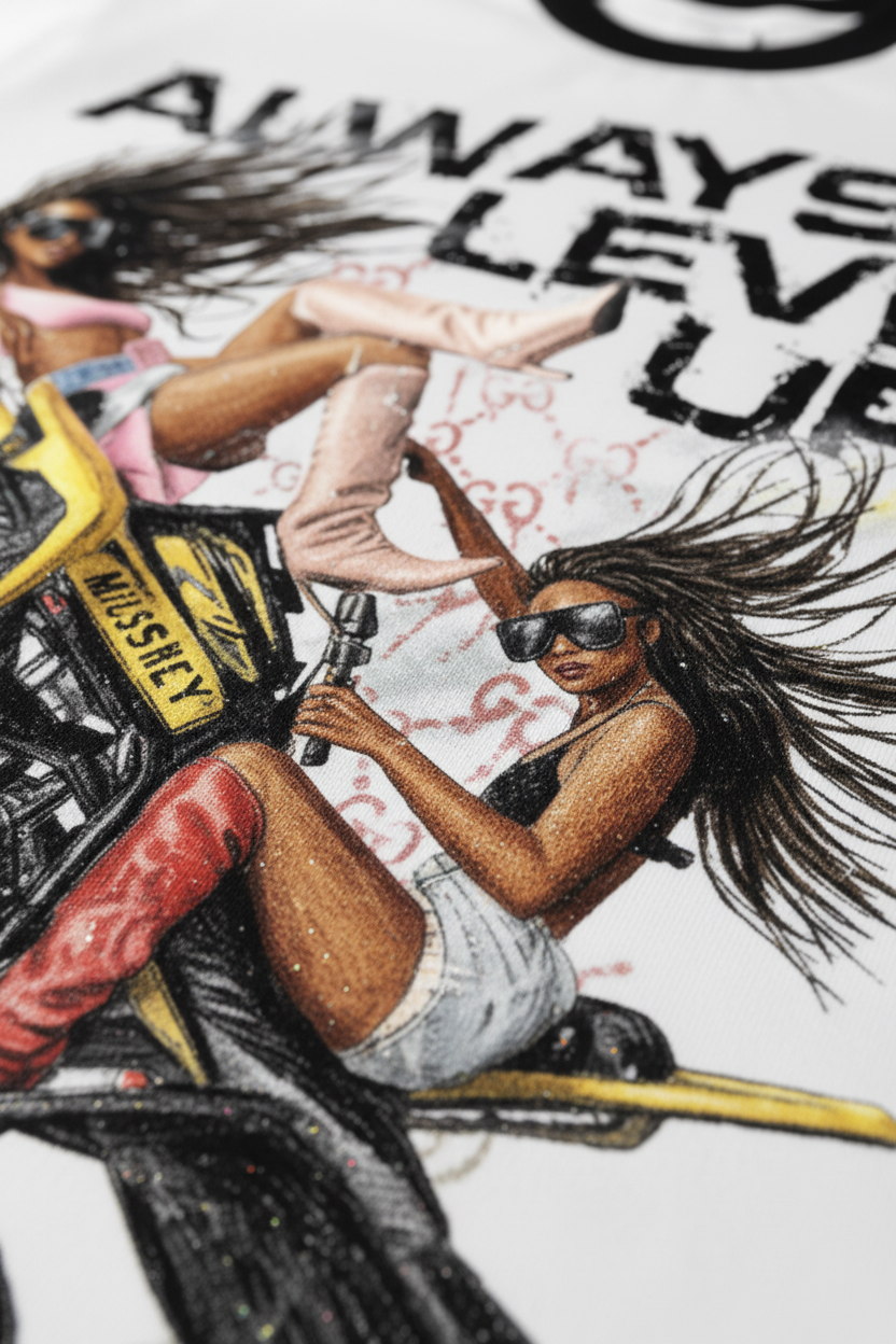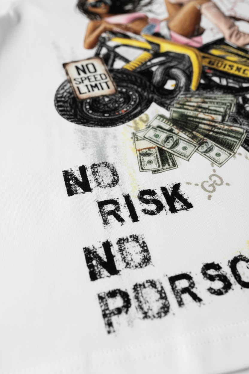 The Hook: Faith in the rise. Glory in the risk. This high-octane T-Shirt features our iconic contrast raglan shoulder construction, framing a cinematic tribute to off-road ambition. Centered around the mantra "ALWAYS LEVEL UP" and the defiant "NO RISK NO PORSCHE", the graphic depicts a bold ATV stunt surrounded by flying cash and desert grit. Designed for those who live by the high-stakes rules of the street, this piece combines performance-inspired paneling with a relentless drive for the top.