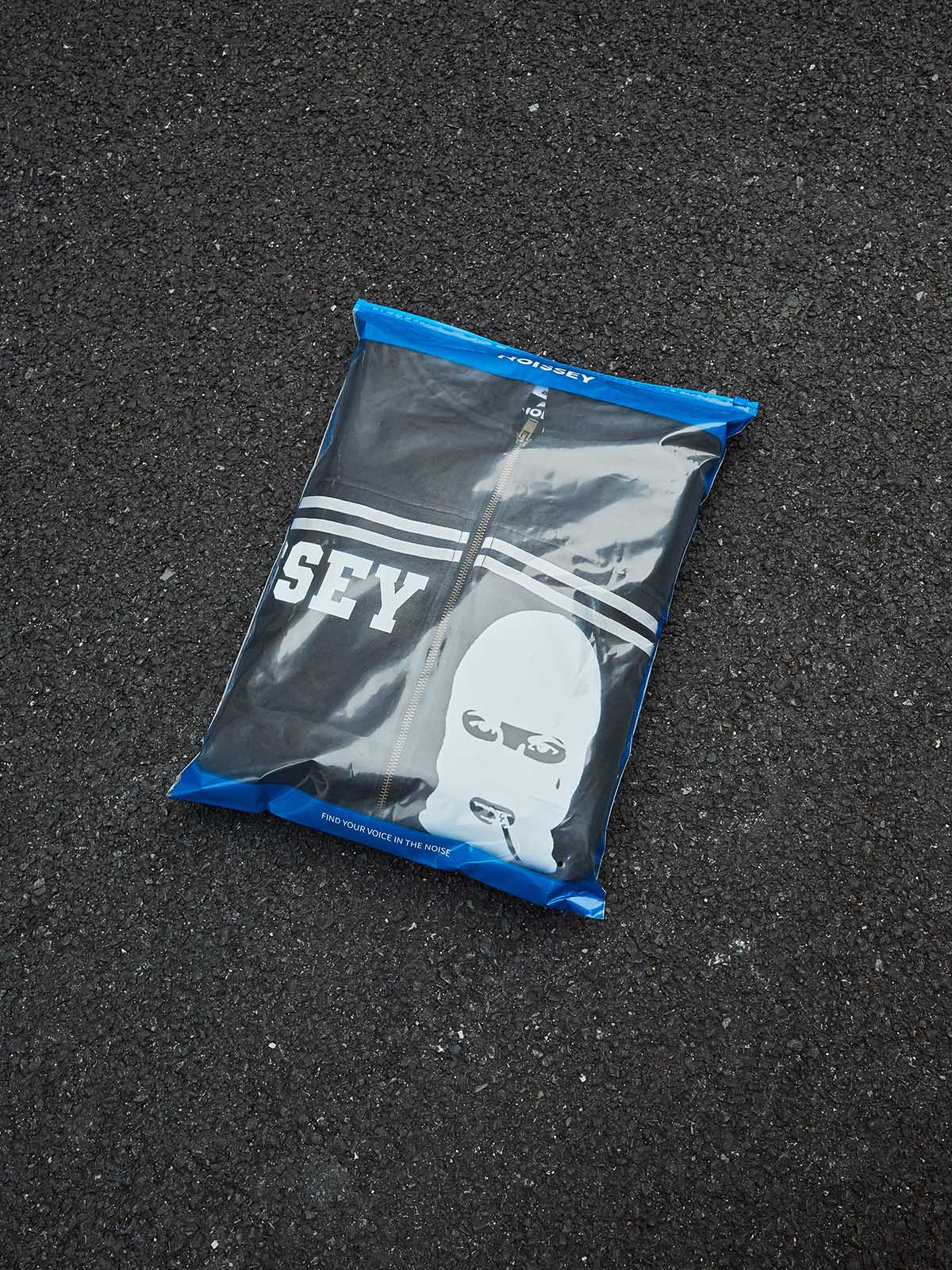 Front view of a black NOISSEY zip-up hoodie featuring a white balaclava graphic, stars, and "Find your voice in the noise" text.