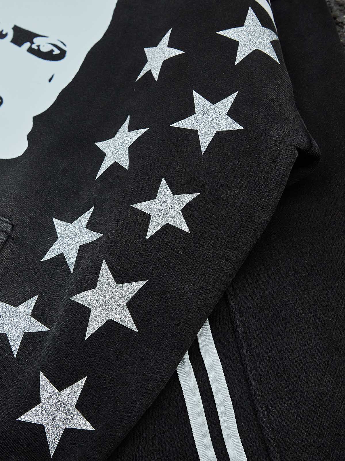 • Iconic Urban Graphics: A bold balaclava motif paired with collegiate-style branding and sparkling distressed stars for a multi-layered visual impact.