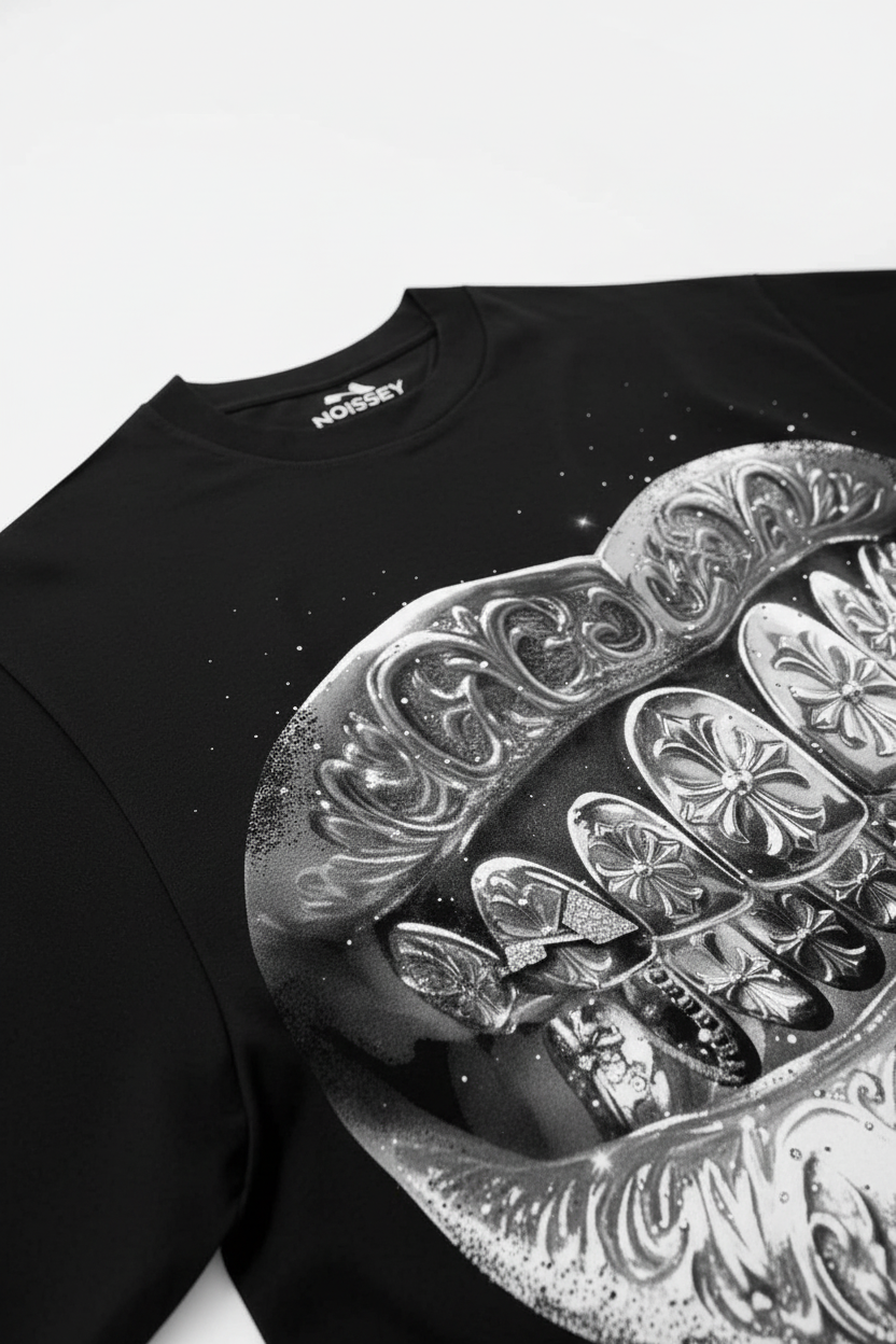 The Hook: Speak in silver. Rule in chrome. This high-impact Short Sleeve T-Shirt features a monumental Chrome Silver Grillz graphic that redefines street-luxury aesthetics. The hyper-realistic design showcases liquid metal lips and meticulously embossed silver teeth adorned with gothic cross motifs. Engineered in an Oversized Boxy Fit, the shirt offers a broad, structured shoulder and a modern cropped length, ensuring the heavy metallic visuals remain sharp and undistorted during wear.