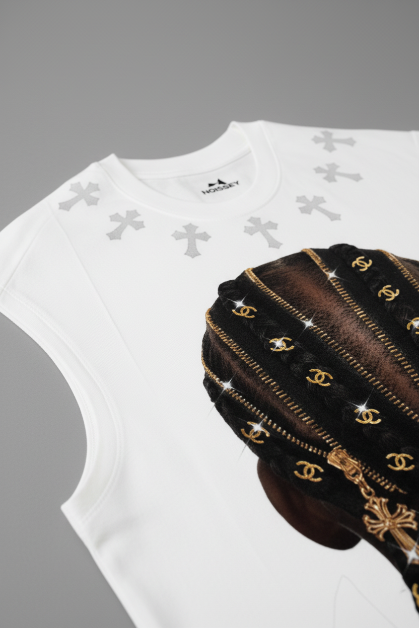 The Hook: Faith in the craft. Power in the details. This high-concept Tank Top celebrates the intersection of urban hair culture and high-end jewelry design. The graphic features a hyper-realistic braided hairstyle embellished with gold zippers, luxury motifs, and crystalline crosses, finished with a multi-layered gold chain and jewel collar. It is a visual masterpiece of texture and shine, designed for those who lead with style from every angle.