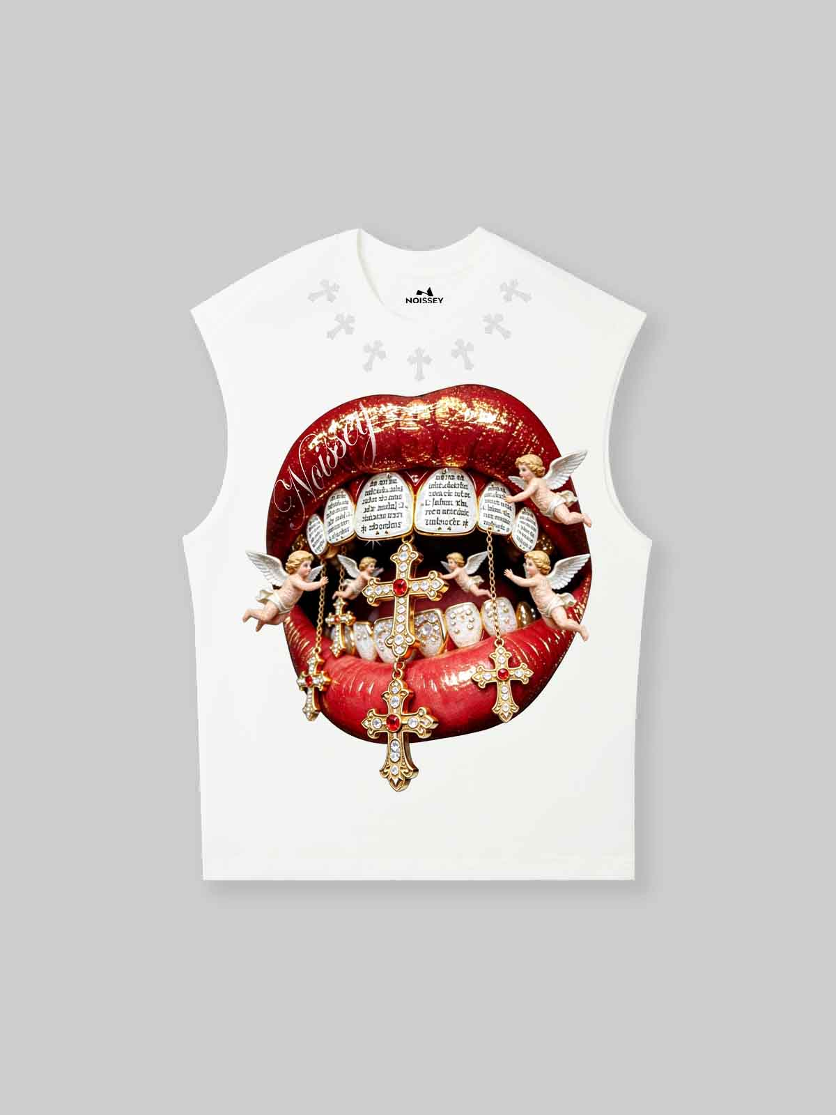 NOISSEY "DIVINE KISS" ANGELIC CROSS ICED OUT RED LIPS GRAPHIC TANK TOP