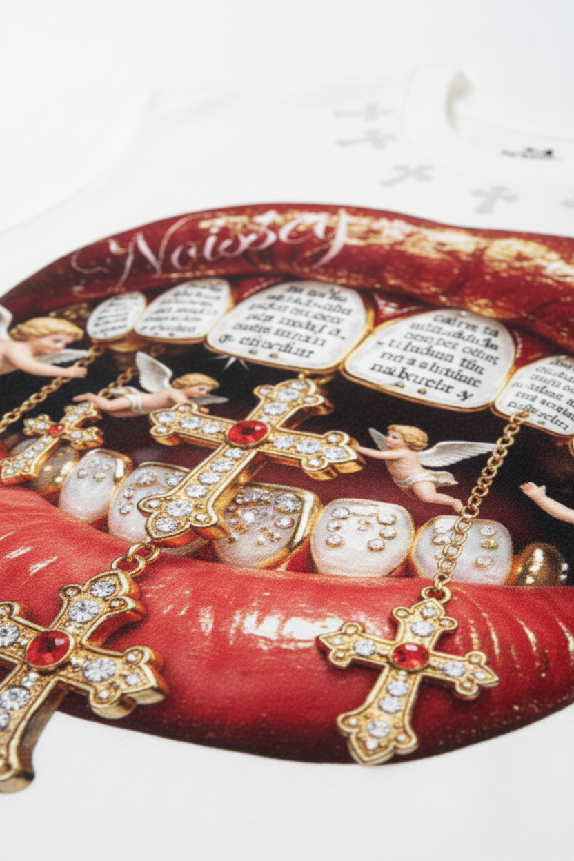 The Hook: Faith in the luxury. Divinity in the details. This high-impact Tank Top features a cinematic graphic of a ruby-red "Iced Out" lip. Within its diamond-encrusted fangs, a group of celestial cupids support a radiant Gold & Ruby Cross. Blending baroque religious symbolism with aggressive modern street aesthetics, this piece is crafted from our signature heavyweight composite fabric for a silhouette that is as divine as it is powerful.