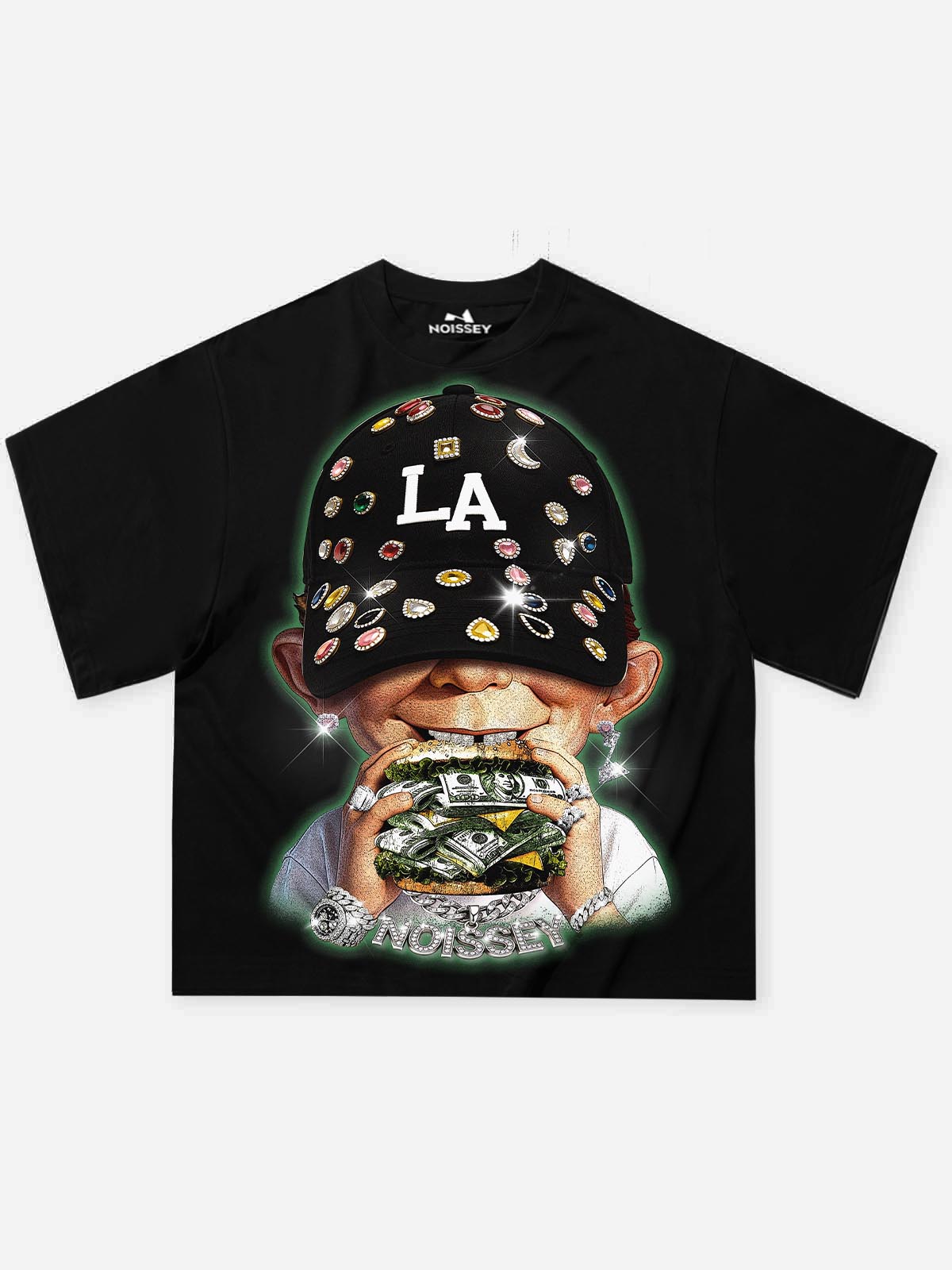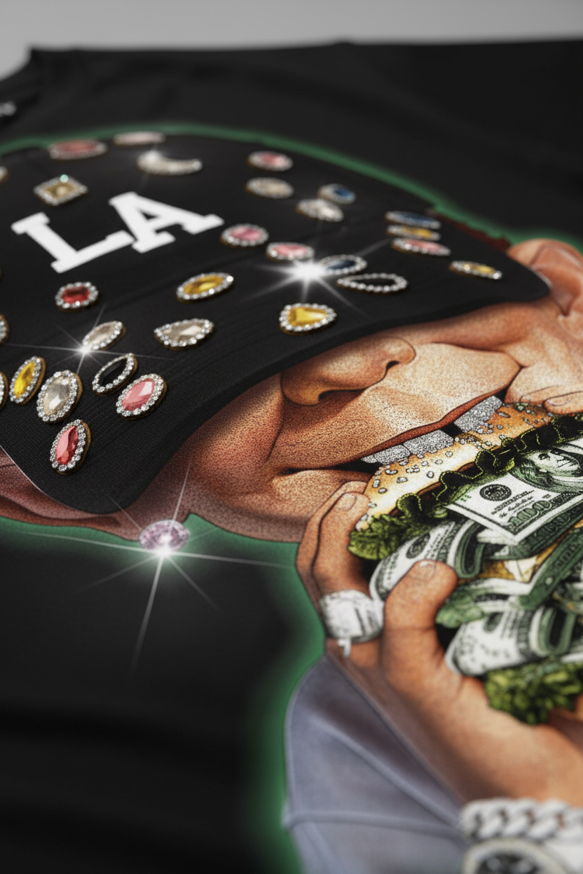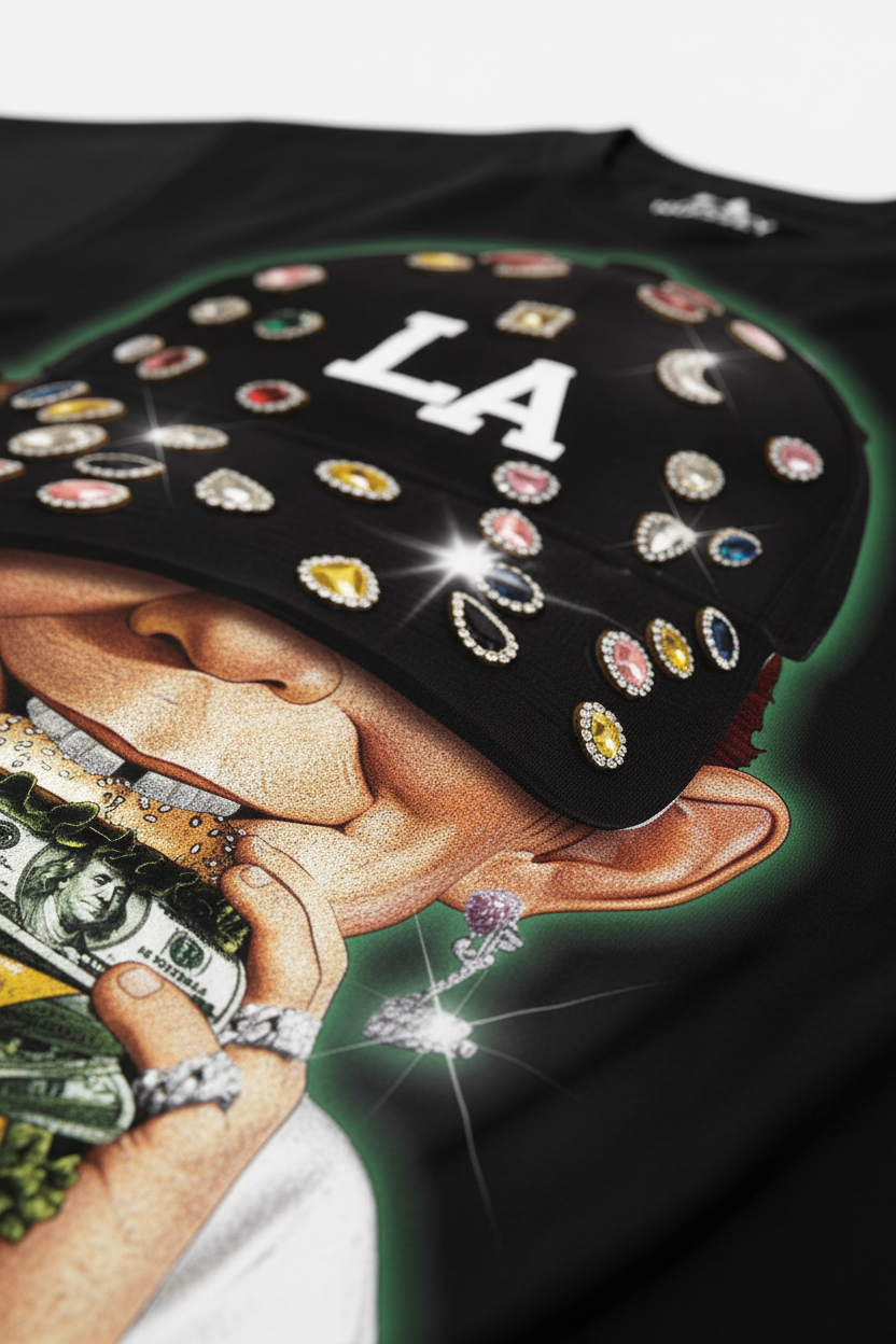 The Hook: A surreal exploration of modern greed and street flamboyance. This heavyweight black tee features the iconic "Alfred E. Neuman" style character, sporting an iced-out "LA" cap and devouring a burger stuffed with crisp dollar bills. The artwork is elevated with "Star-Dust" glitter detailing on the colorful diamonds and jewelry, creating a shimmering 3D effect that captures the essence of "Rich Kid" subculture. It’s a loud, satirical masterpiece for the bold.