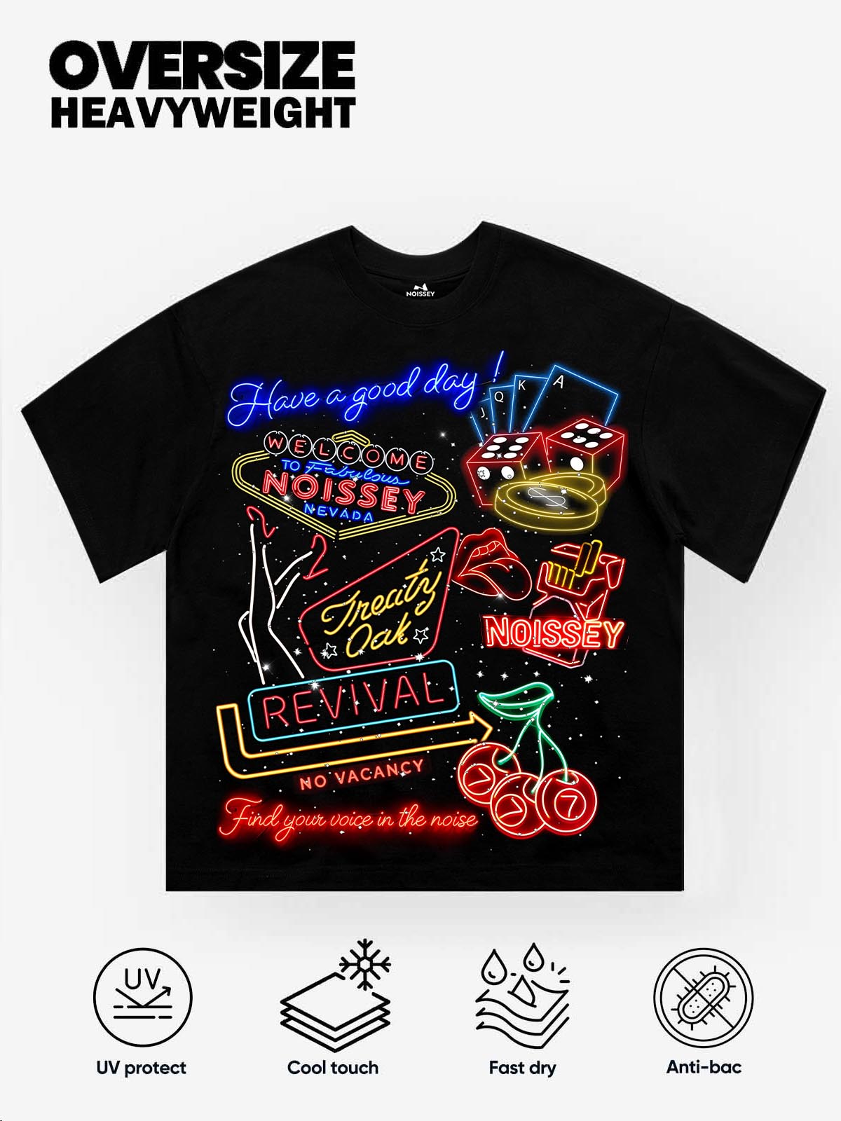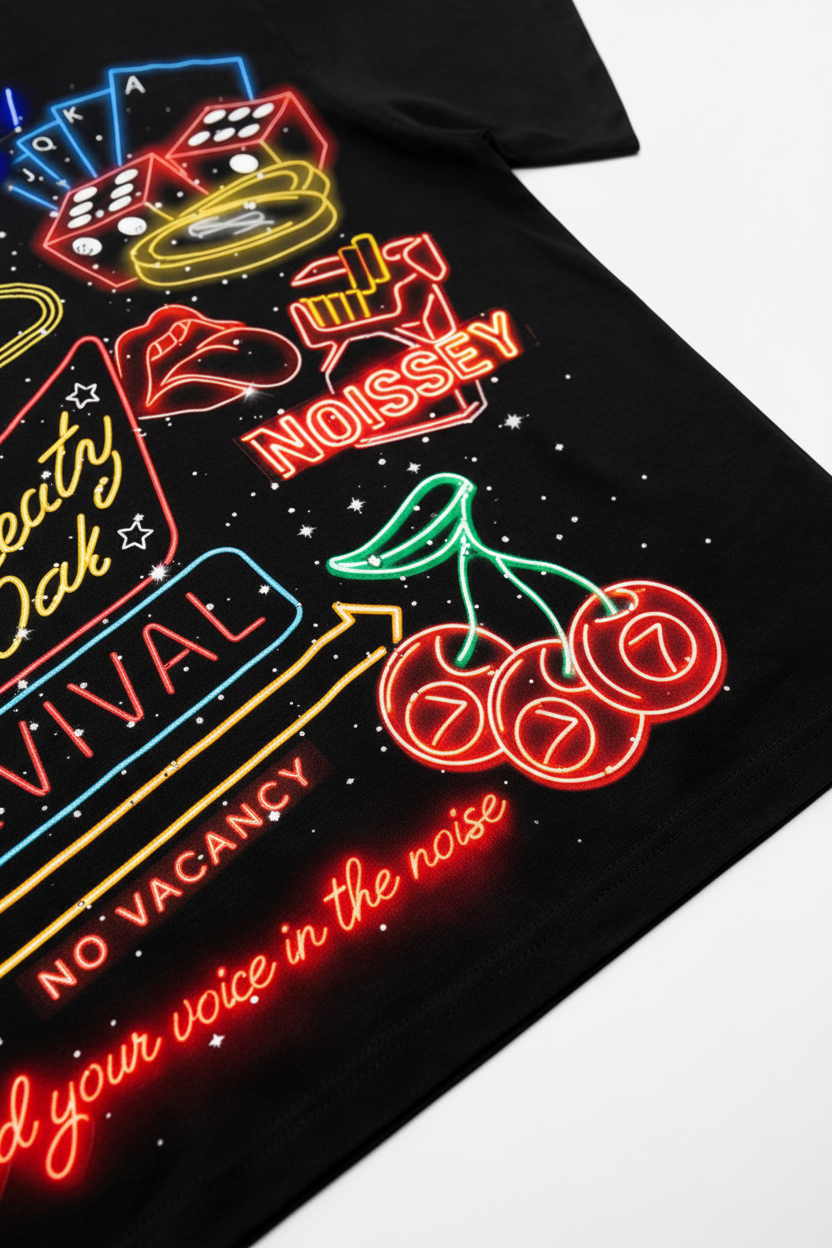 The Hook: Faith in the wild. Luck in the lights. This piece captures the electric soul of the Las Vegas strip, featuring a vintage neon sign graphic brought to life with shimmering rhinestone embellishments that catch every flicker of city light.