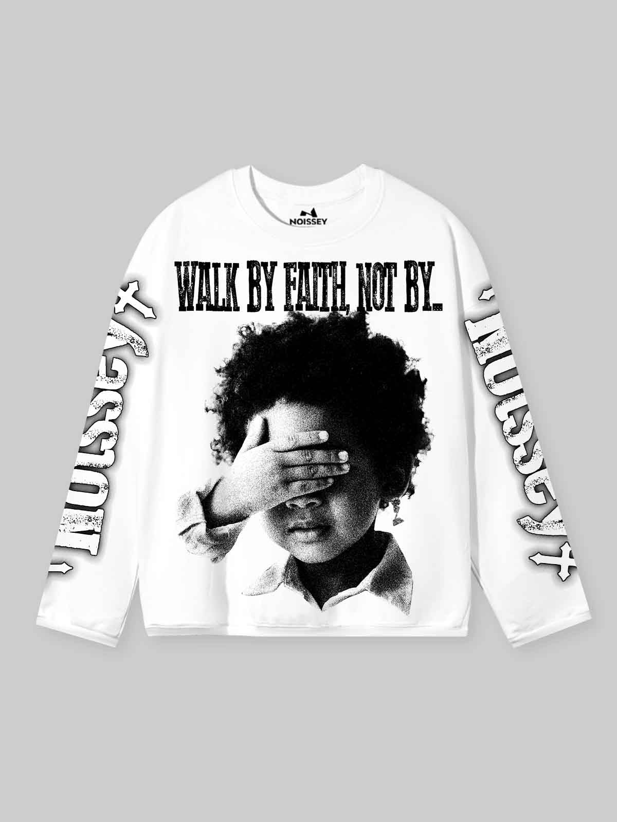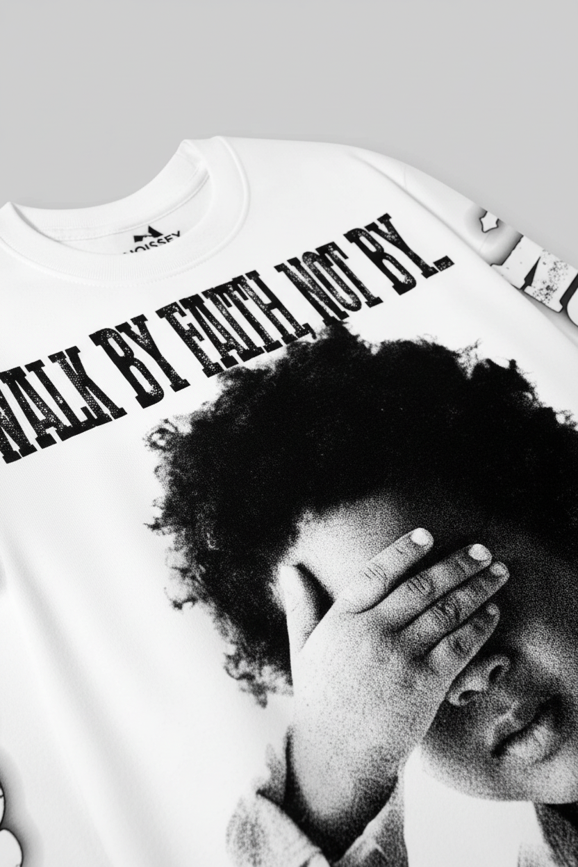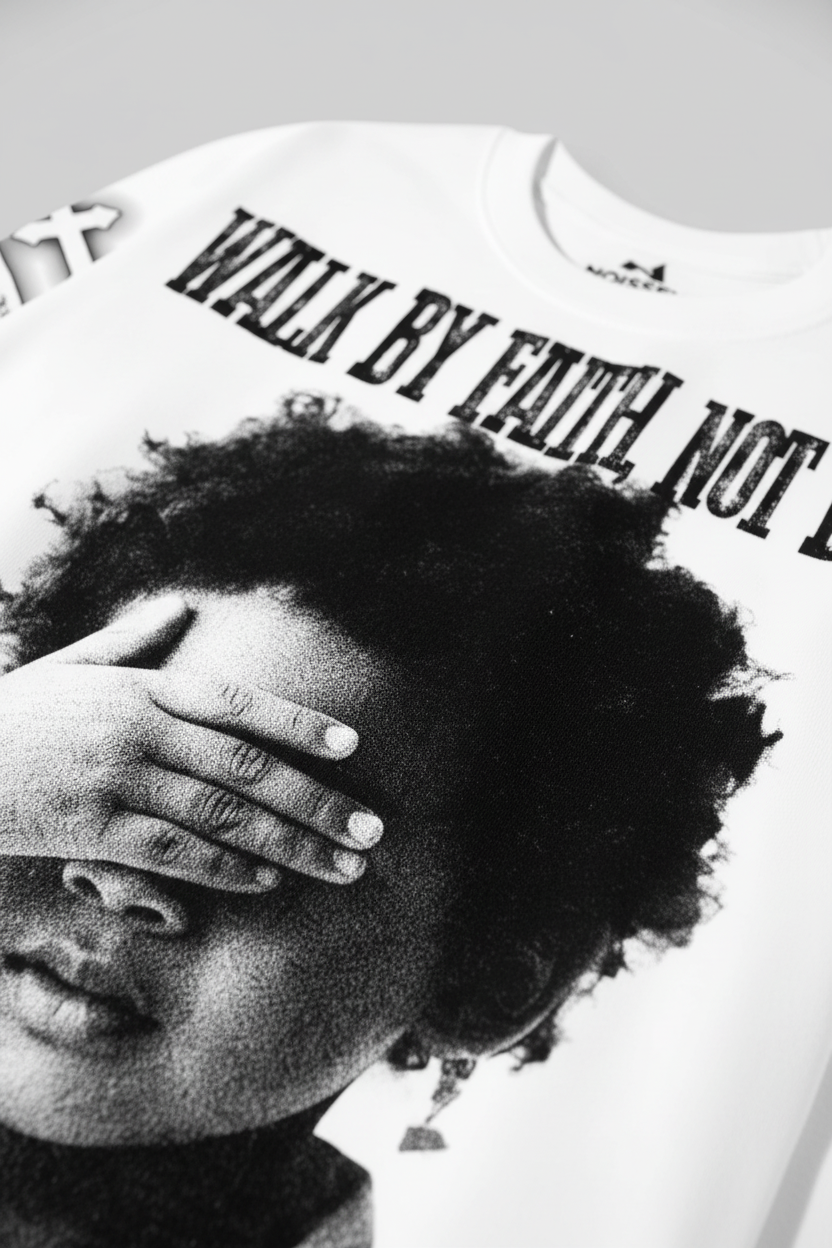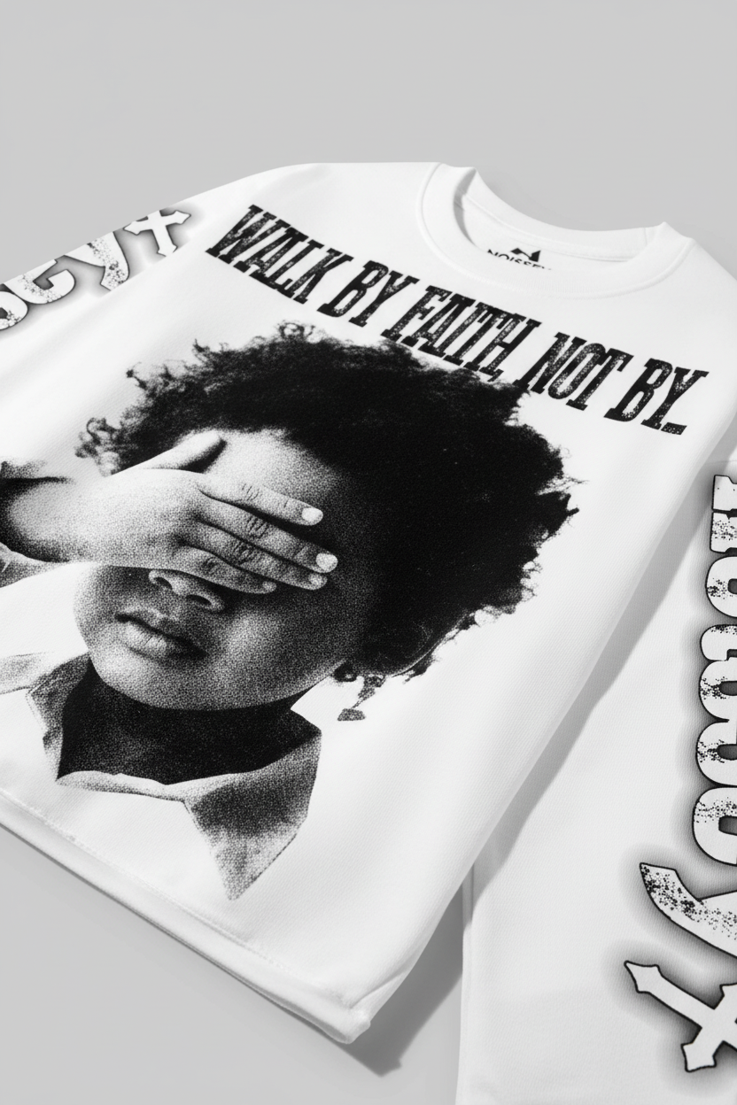 The Hook: True vision comes from within. This evocative Long Sleeve T-Shirt centers on a powerful black-and-white stippled portrait of a child covering their eyes, paired with the timeless mantra: "WALK BY FAITH, NOT BY SIGHT". The design is framed by bold, gothic-inspired Noissey branding stretching down both sleeves, creating a stark visual contrast that balances high-art photography with raw street typography. It is a piece for those who trust their internal compass and move forward with unshakeable conviction.