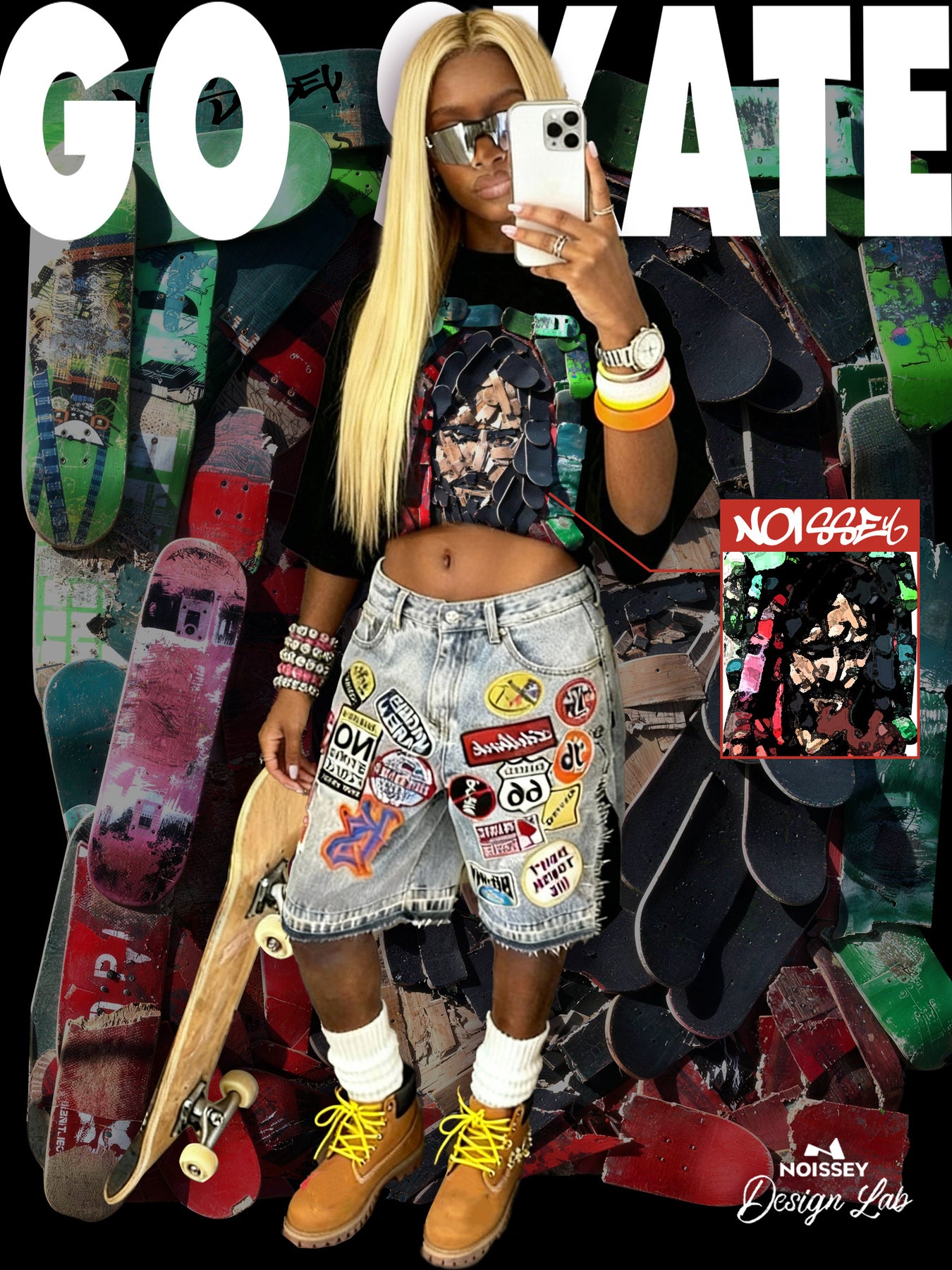 This T-shirt features a skateboard character collage print. It has a boxy fit, shorter in length, wider in body, with longer, roomy sleeves. Perfect for a laid-back, street-smart look. Get yours now!