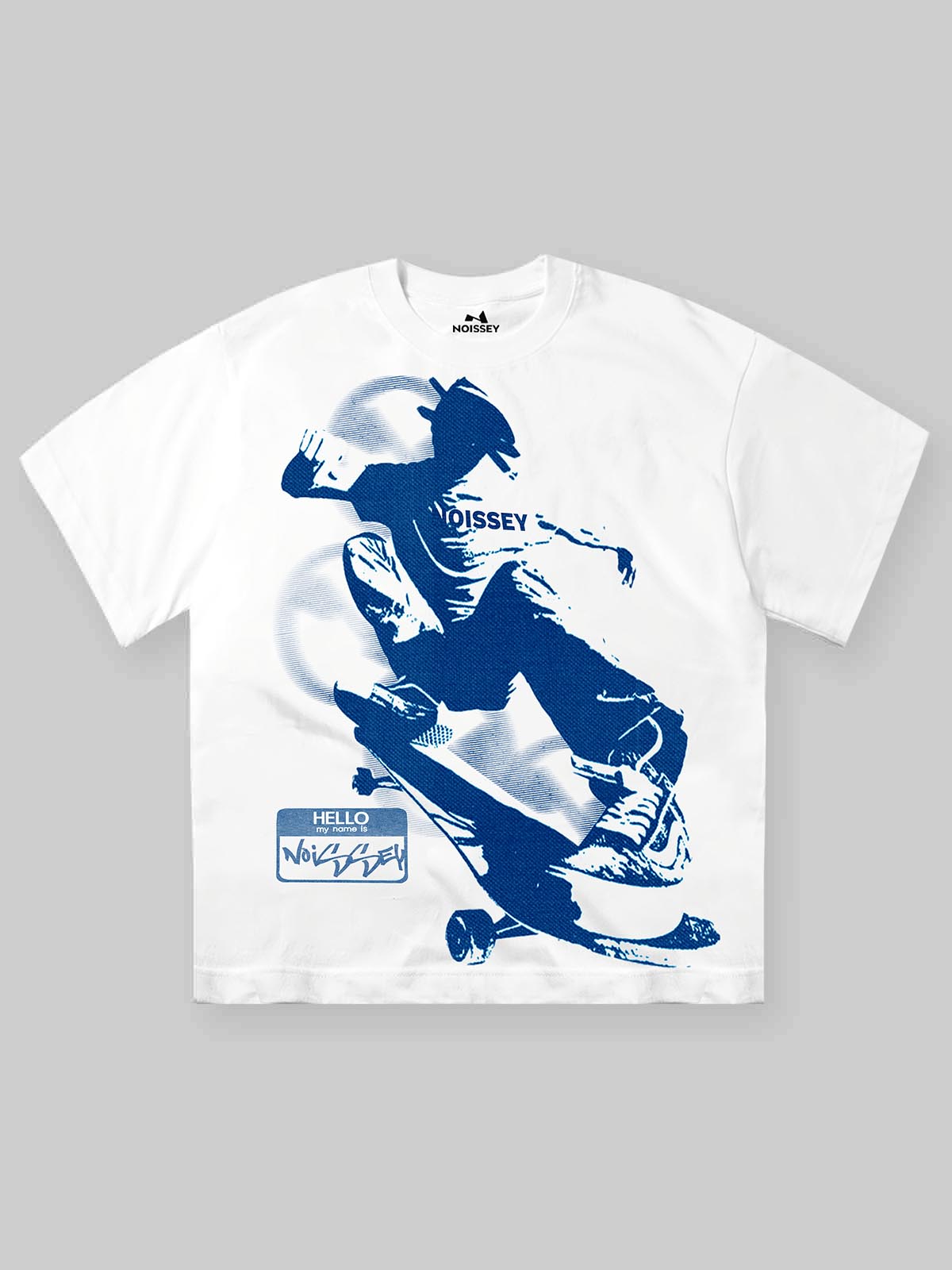 This T-shirt features a striking blueprint monochrome print of a skateboarding teen in action. It's crafted for comfort, with a soft fabric that feels great against the skin. Perfect for casual wear or showing off your skateboarding spirit. Get yours now!