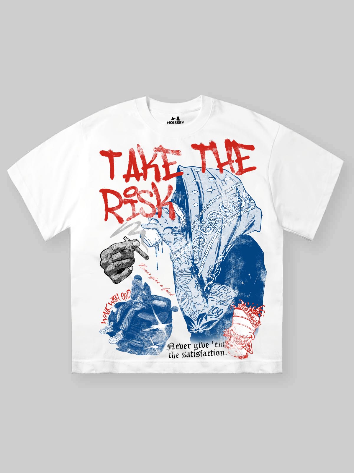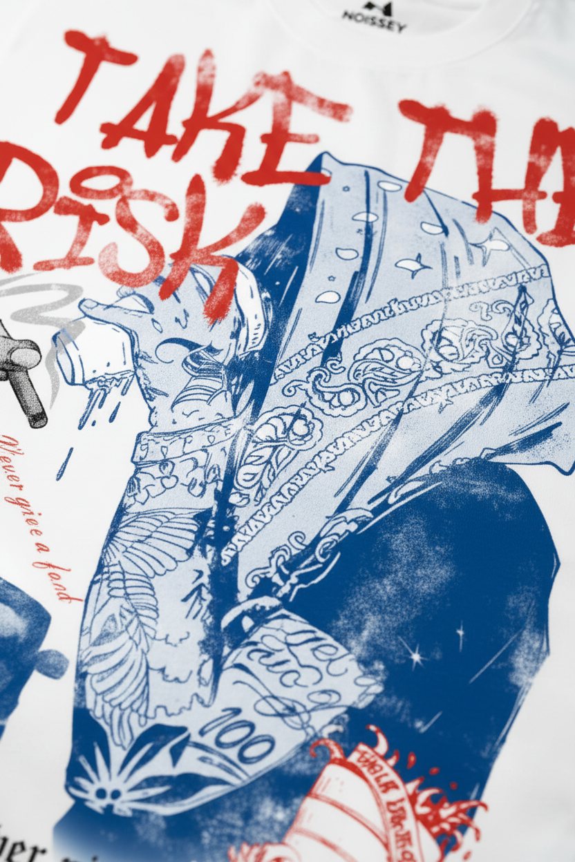 Dare to stand out! This bold T-shirt features a striking double-color graffiti portrait paired with the rebellious slogan 'Take the Risk.' Perfect for those who embrace creativity and individuality. Crafted with premium cotton for all-day comfort. Elevate your streetwear game now!