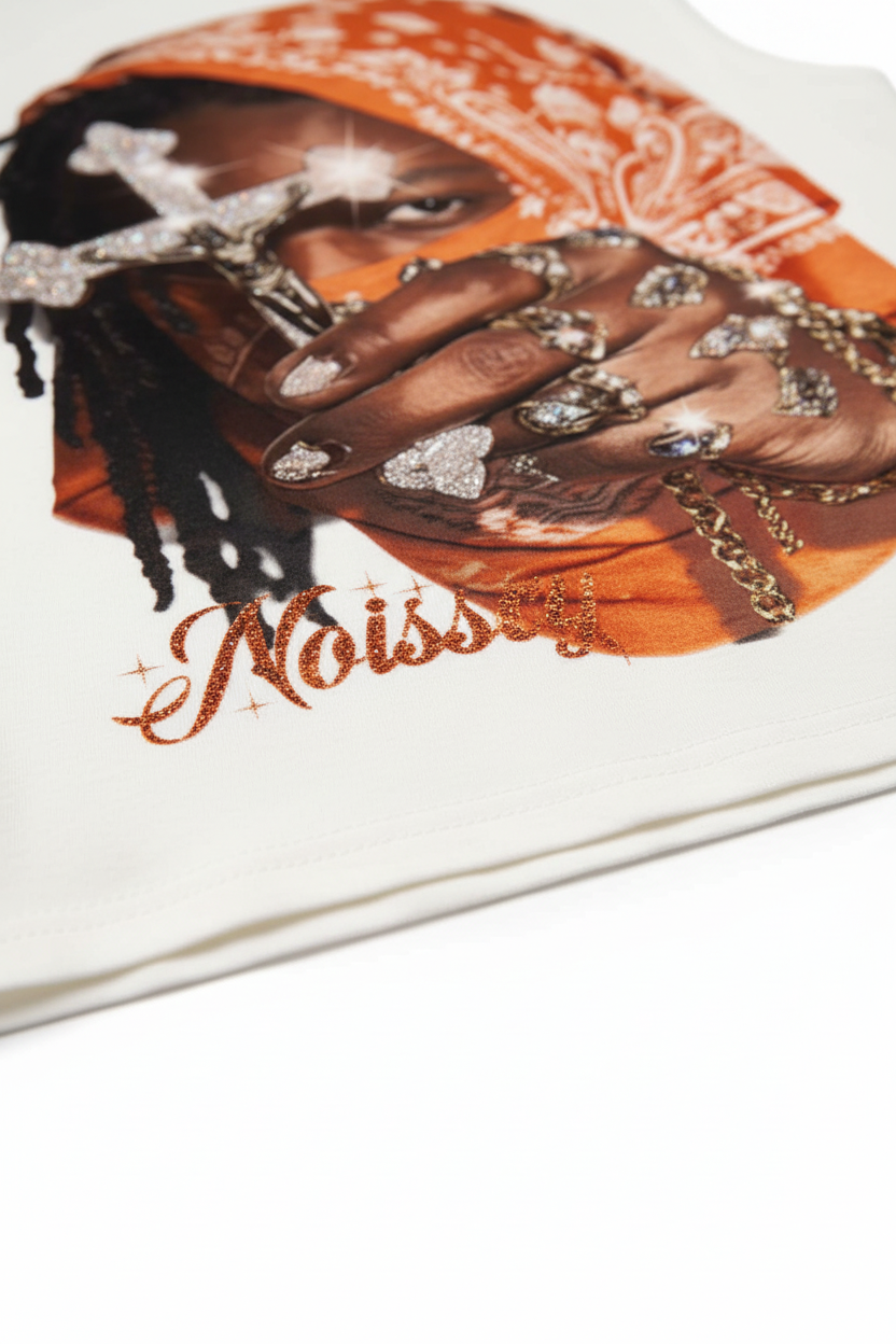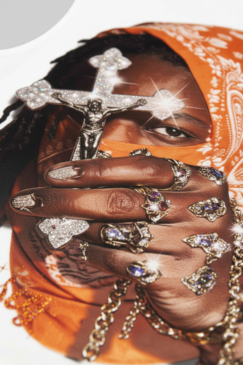 The Hook: Faith in the wild. Devotion in the soul. This high-impact Tank Top features a compelling graphic of a figure in an orange paisley bandana, clutching a shimmering, diamond-encrusted crucifix. With hyper-realistic jewelry details and a gaze full of conviction, this piece symbolizes the intersection of sacred faith and the gritty opulence of the streets.