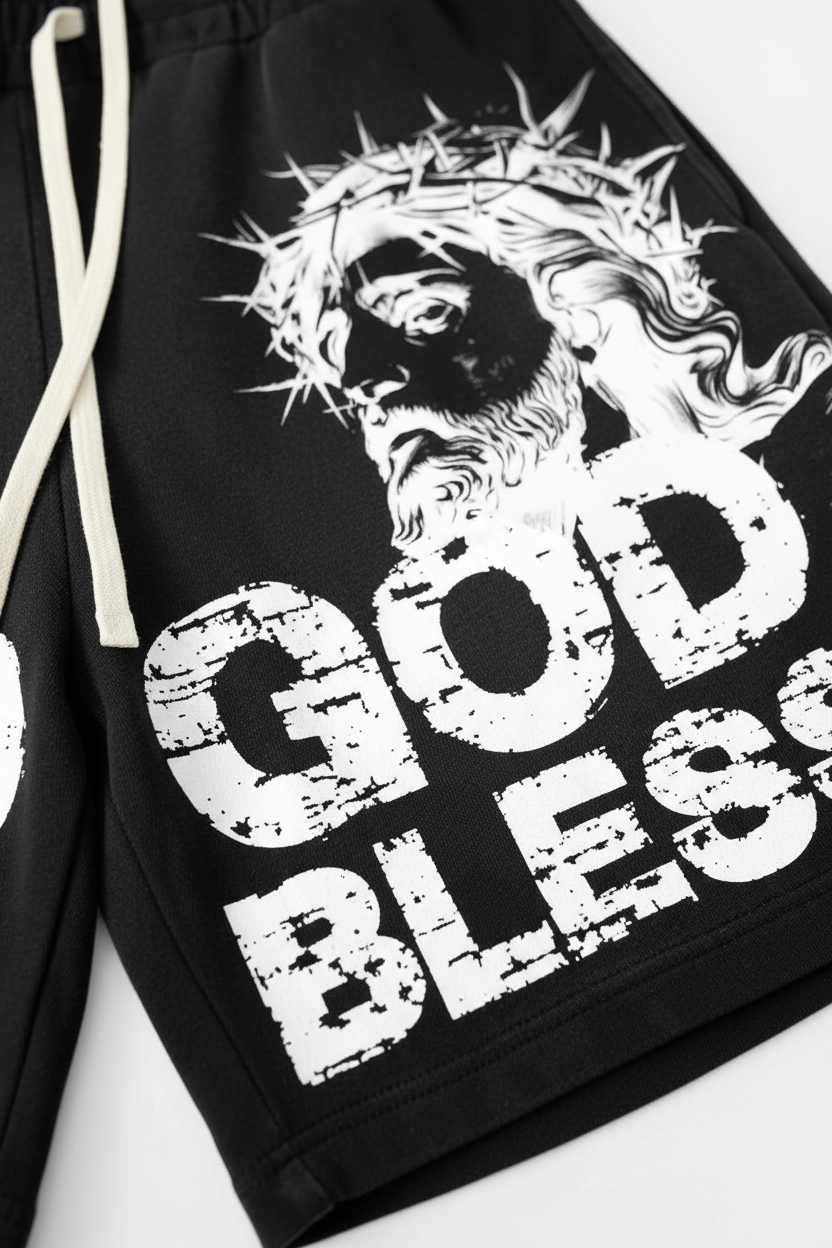 • Art Print: High-definition digital screen print featuring the iconic thorn crown portrait and "GOD BLESS" bold typography.
