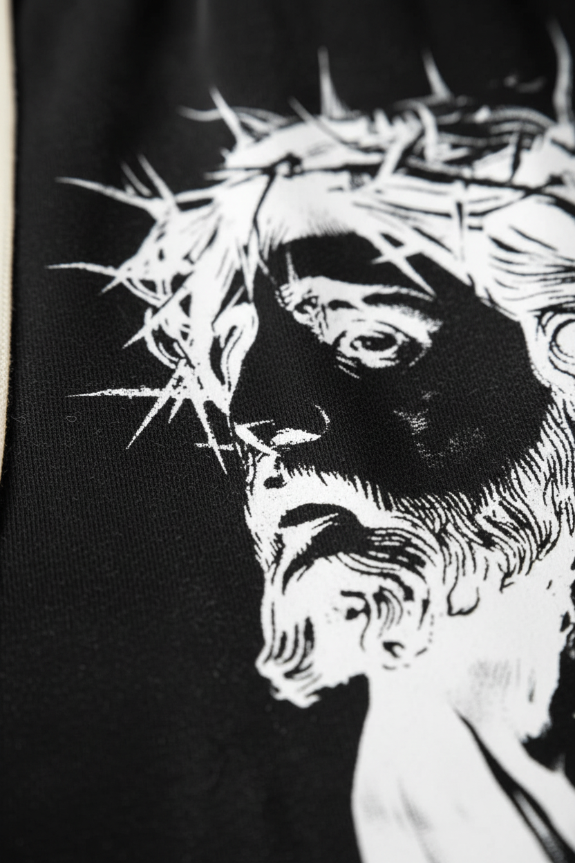 The Hook: A fusion of reverence and rebellion. These Wide-Leg Relaxed Sweatpants feature a high-contrast graphic layout that demands attention. The left leg is anchored by a hyper-detailed portrait of Jesus with the Crown of Thorns, while the right leg balances the visual weight with a bold, distressed "GOD BLESS" block-lettering print. Overlaid with a subtle "Noissey" script signature, these pants utilize a monochromatic white-on-black palette to deliver a powerful spiritual statement through a raw, urban lens.