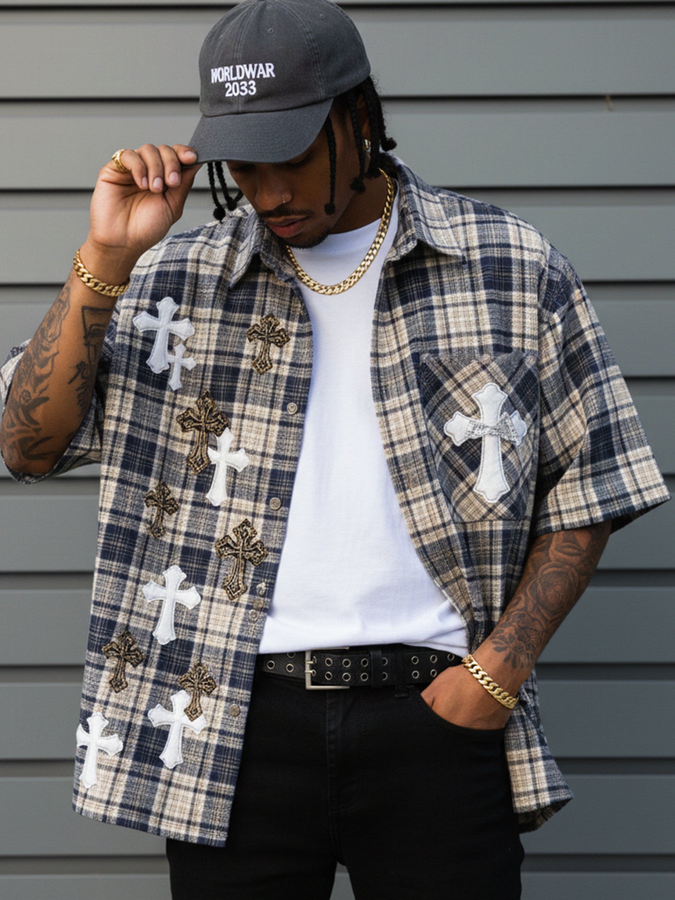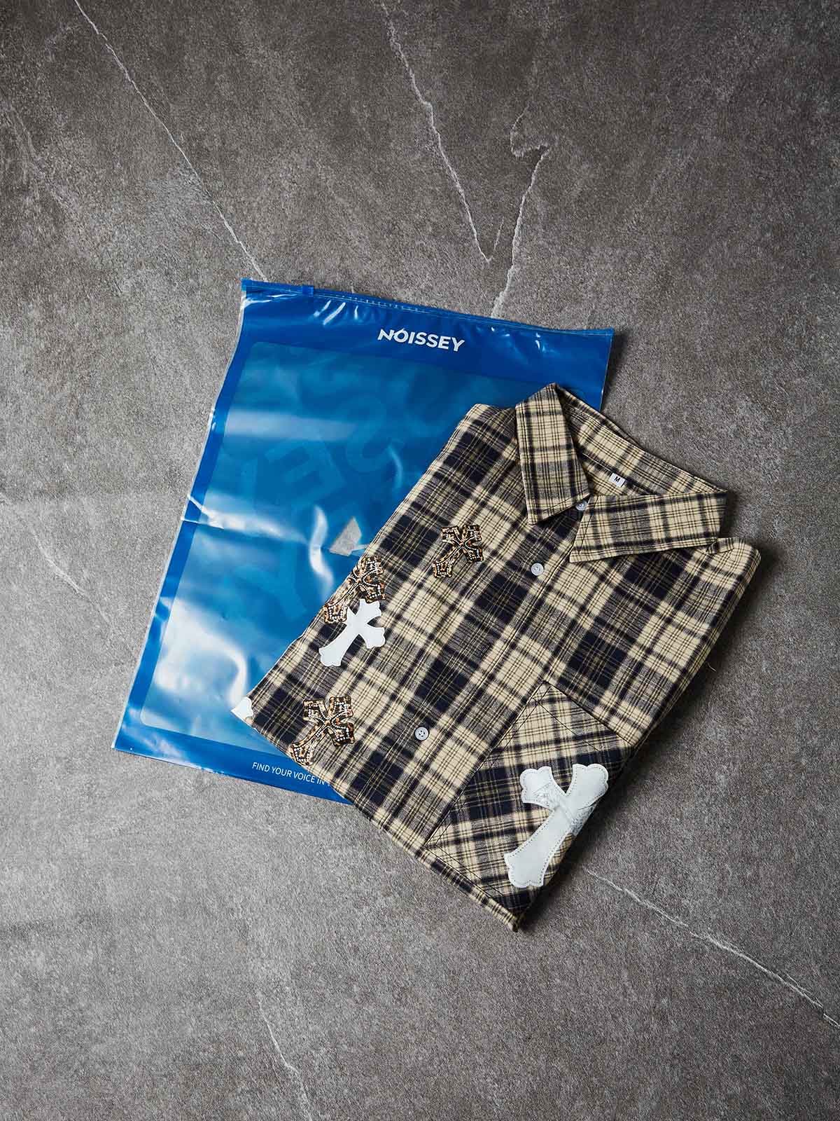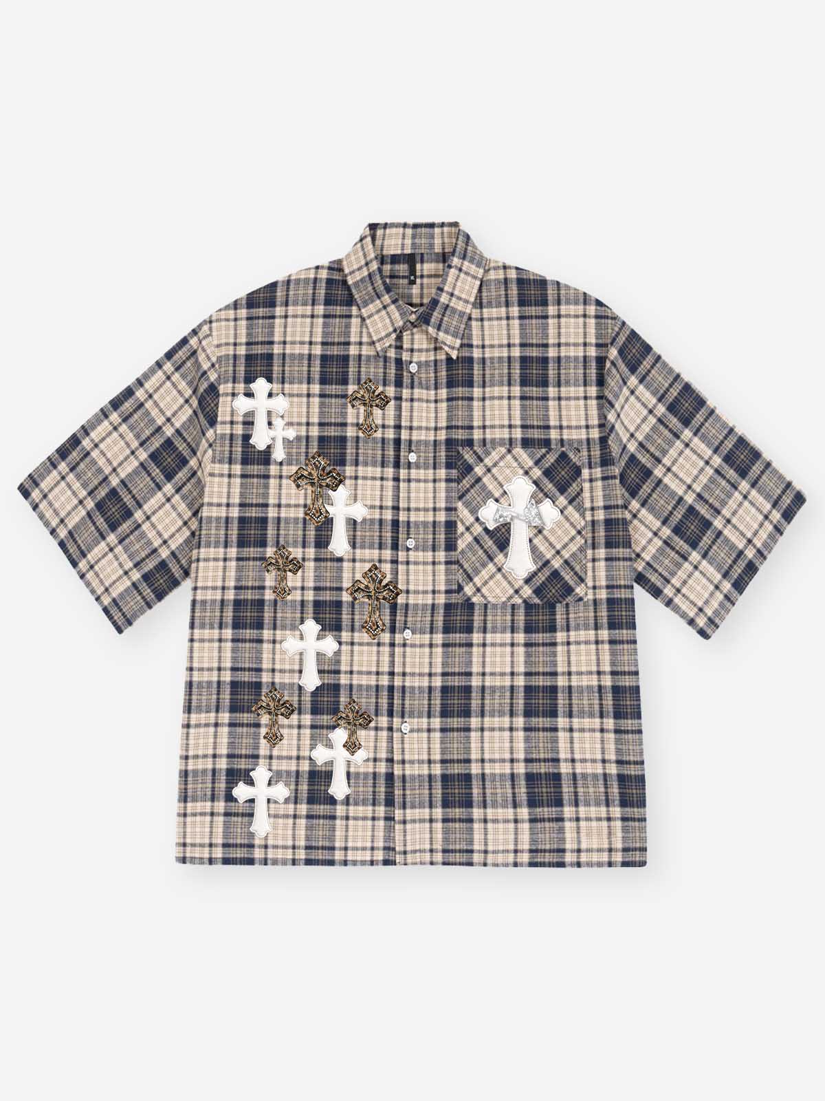 The Hook: A masterclass in deconstructed layering. This Relaxed Shirt elevates a traditional blue-and-tan plaid with a complex, scattered arrangement of Hand-applied Cross Patches. The design features a dynamic mix of Tactile White Leather-feel Crosses and Savage Leopard-print Crosses, each secured via high-precision heat-press technology to create a rugged, multi-dimensional aesthetic. Finished with a signature cross overlay on the chest pocket, this piece balances classical structure with an aggressive, modern edge.
