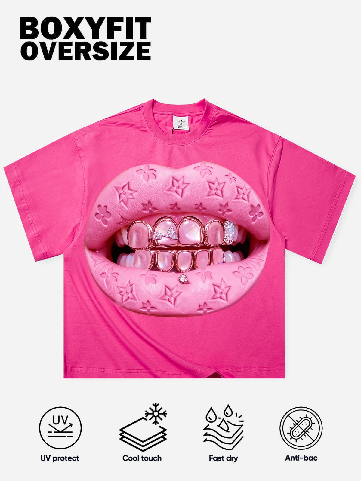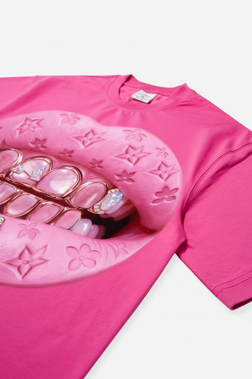 The NOISSEY Pink "Leather Cat's Eye" Tee serves pure Y2K attitude with a hidden performance edge. Drenched in vibrant Hot Pink, the graphic features massive lips with a luxury leather-monogram texture, biting down on a set of gleaming gold grillz.