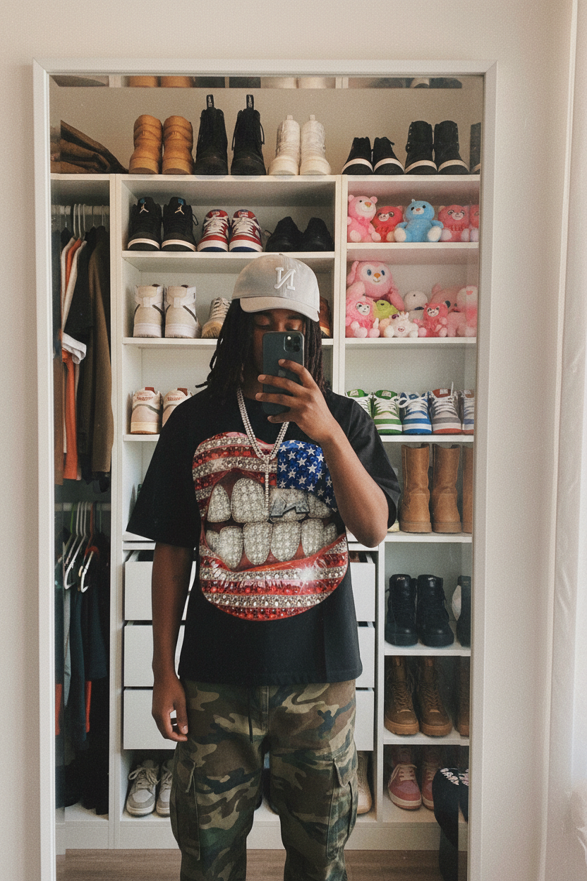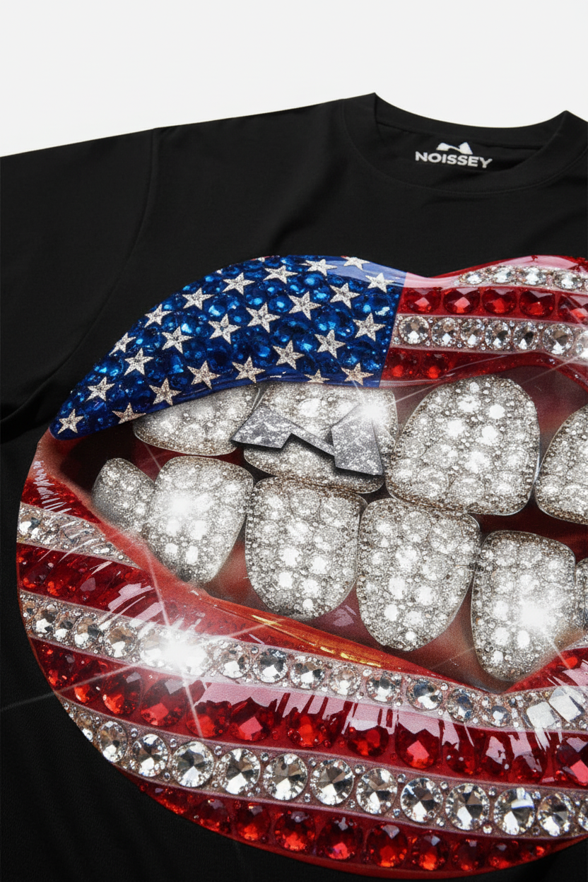 This National Flag Rhinestone Art Grills print T-shirt features a boxy oversized fit with a shorter length, wider cut, and longer sleeves, offering both comfort and style. Grab yours now!