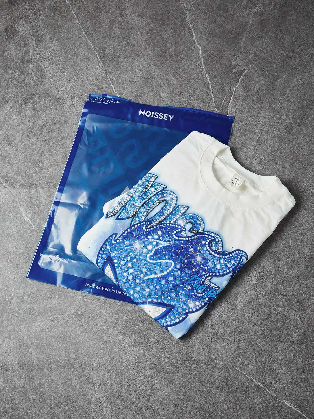 The Hook: A frozen revolution in street aesthetics. This heavyweight white tee features an oversized "Flame Boy" character completely encrusted in hyper-realistic blue diamonds and sapphires. Surrounded by a matching icy blue "NOISSEY" logo and a misty aura, the design utilizes "Star-Dust" glitter technology to ensure the graphic sparkles like a raw gem under any light source. It is the definitive "cool" statement for the high-summer season.