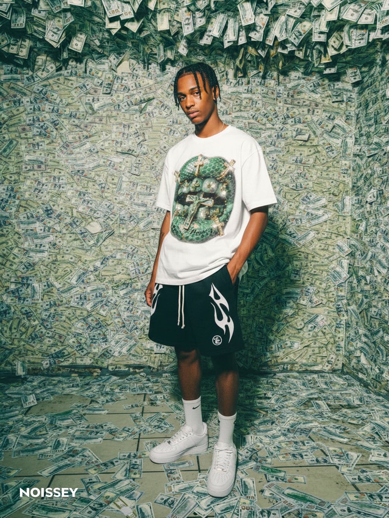 The Hook: Faith in the wild. Identity in the skin. This striking Boxy Fit tee features a hyper-realistic graphic of lips clad in emerald-toned snakeskin, biting down on "Iced Out" bronze Grillz. Centralized by a heavy crucifix and adorned with shimmering gold-encrusted crosses, it’s a high-definition fusion of predatory textures and spiritual symbolism.