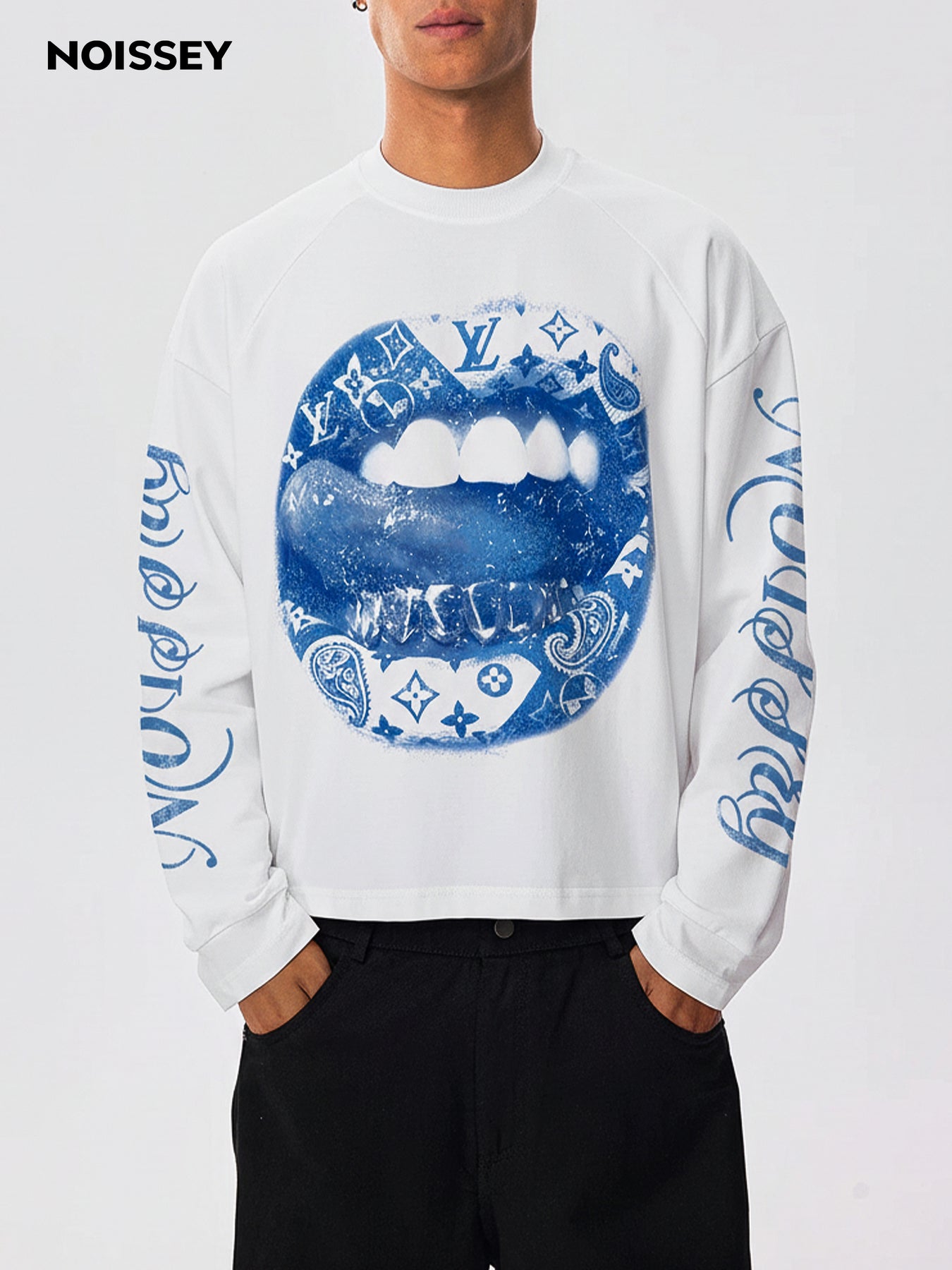 NOISSEY "HUSTLE" BLUE PAISLEY LIP GRAPHIC LONG SLEEVE - WHITE/ICE BLUE