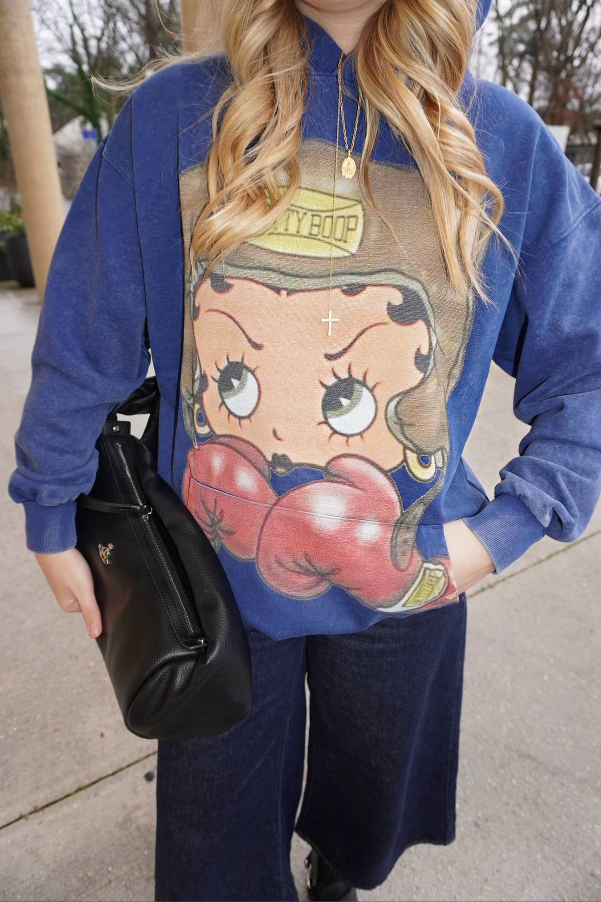 A heavy hitter in vintage street style.The NOISSEY "Boxing Girl" Hoodie is built for those who appreciate substance. Crafted from premium 425g heavyweight cotton, this piece offers a structured, oversized fit that holds its shape perfectly.Featuring a retro-inspired cartoon graphic of a boxing girl, this hoodie blends nostalgic Y2K aesthetics with a tough, street-ready attitude. The fabric has undergone a specialized vintage wash process, giving it that authentic, lived-in blue fade from day one.Why this hoodie hits different: