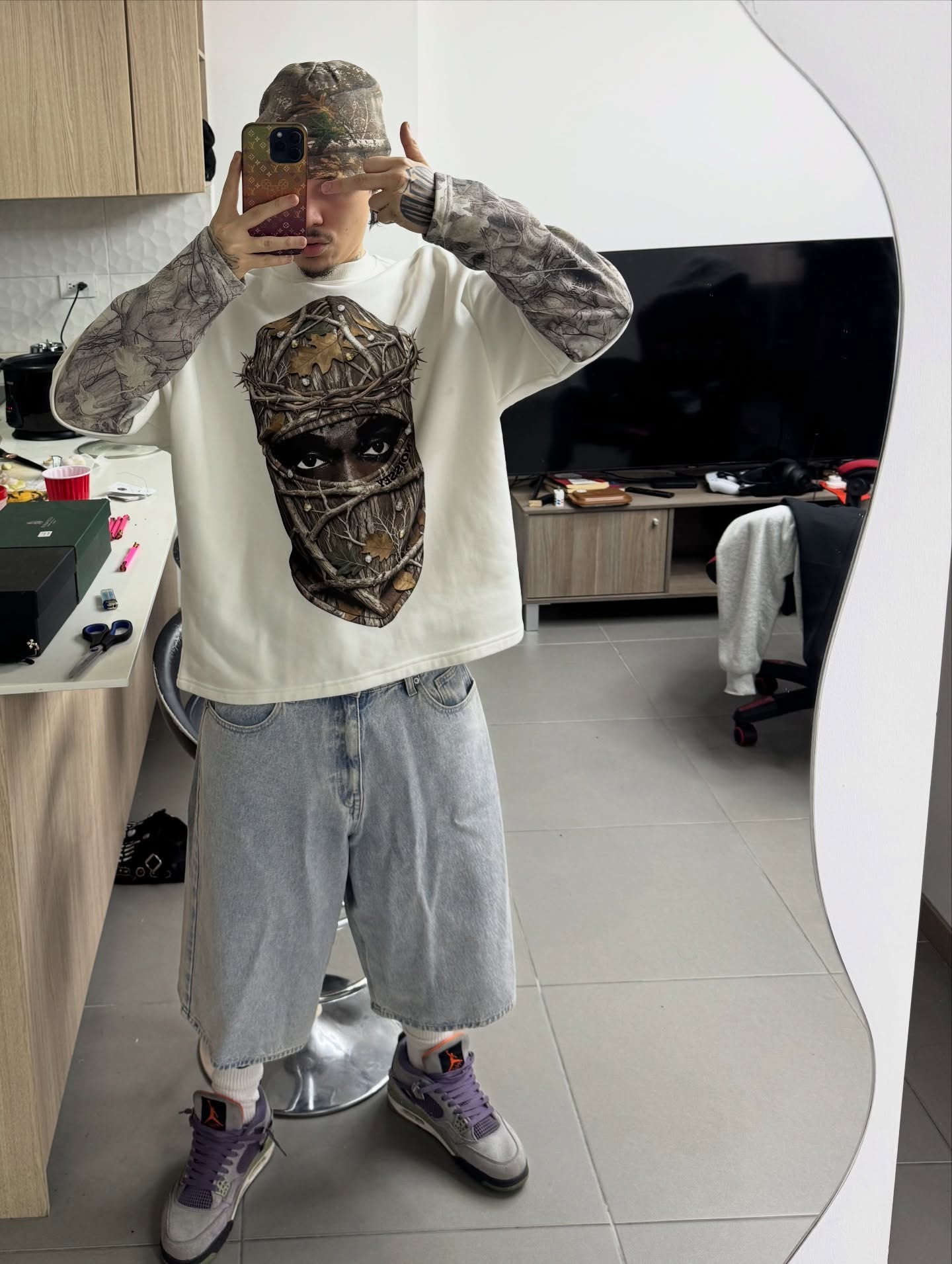 "URBAN CAMO" PORTRAIT PATCHWORK CREWNECK – BONE WHITE OVERSIZED LONG SLEEVE