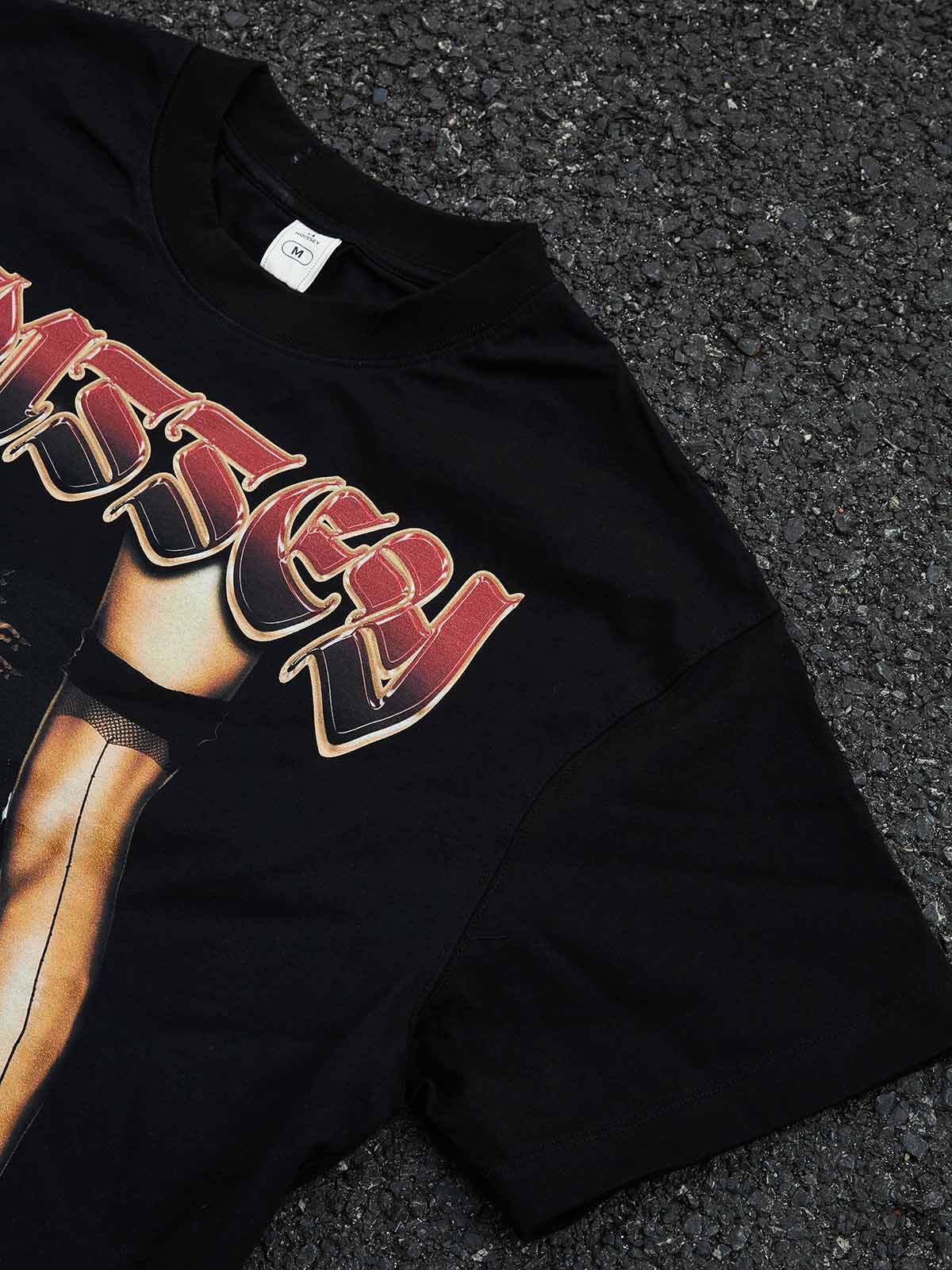 Iconic Aesthetic: Combining 90s bootleg rap tee vibes with contemporary graffiti art and gothic typography.