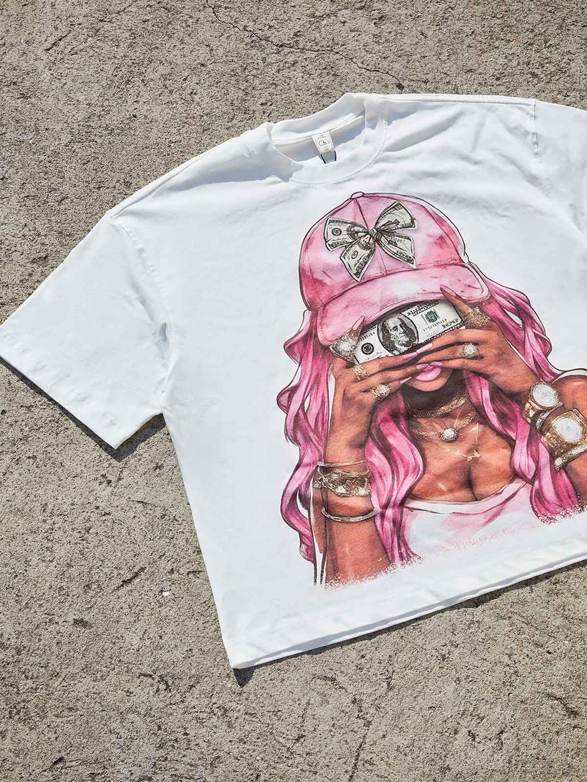 Let your outfit do the talking. The "Money i$ the Motive" Boxy Oversized Tee is designed for the hustlers and trendsetters who live for the street aesthetic. Featuring a striking graphic of a pink-haired icon adorned with luxury jewelry and dollar-bill accents, this piece seamlessly blends Y2K nostalgia with modern high-street fashion.