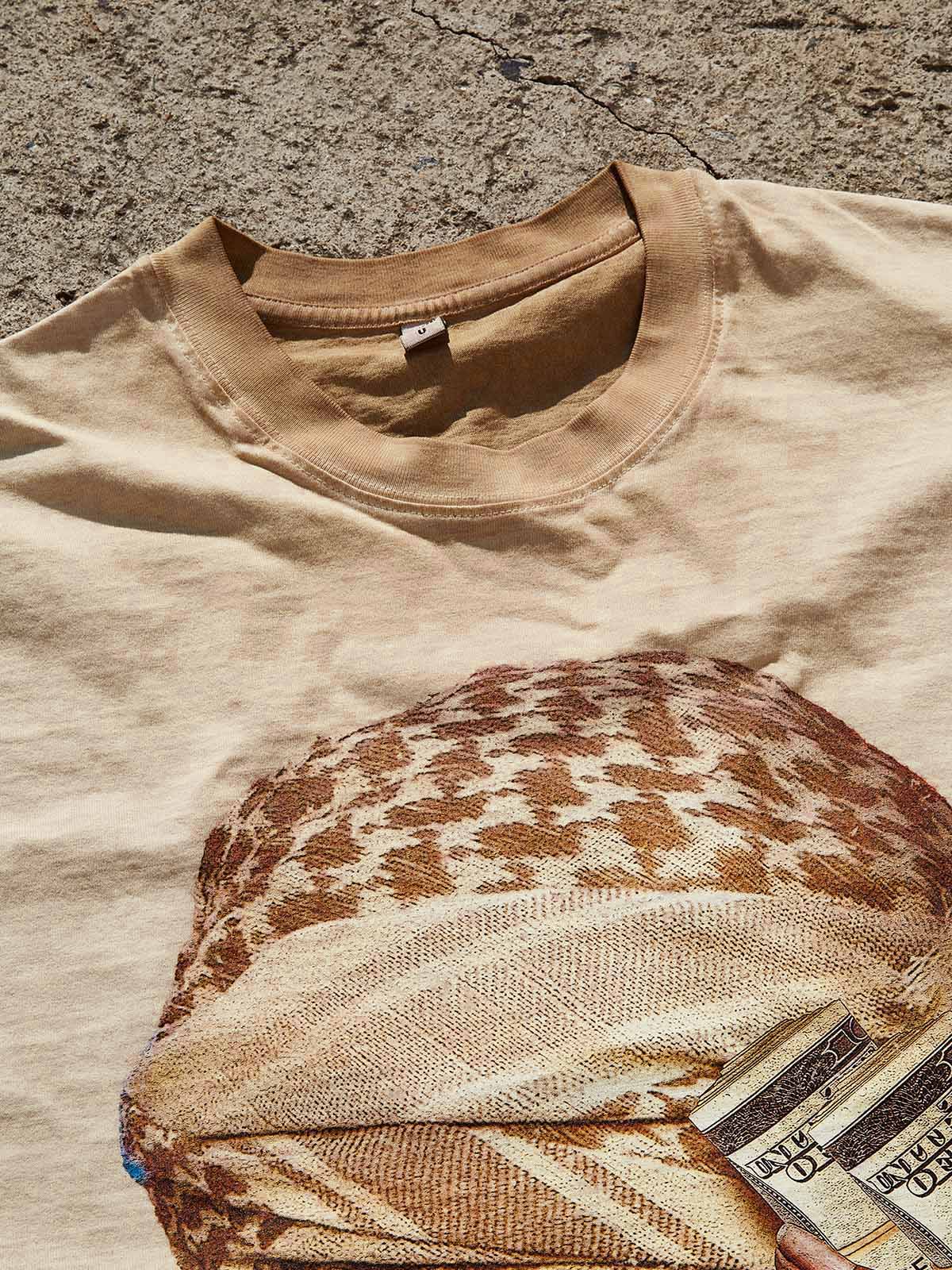 Command the Concrete Jungle. The NOISSEY "Desert Mirage" Tee blends traditional desert aesthetics with raw urban ambition. This high-impact graphic features a photorealistic print of a figure in a classic shemagh (sand-toned bandana), clutching rolls of currency and adorned with "iced-out" jewelry.