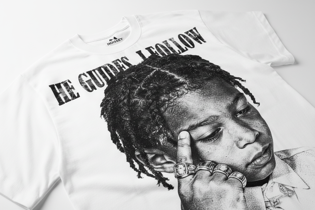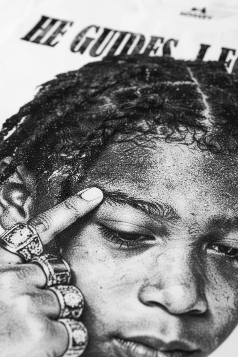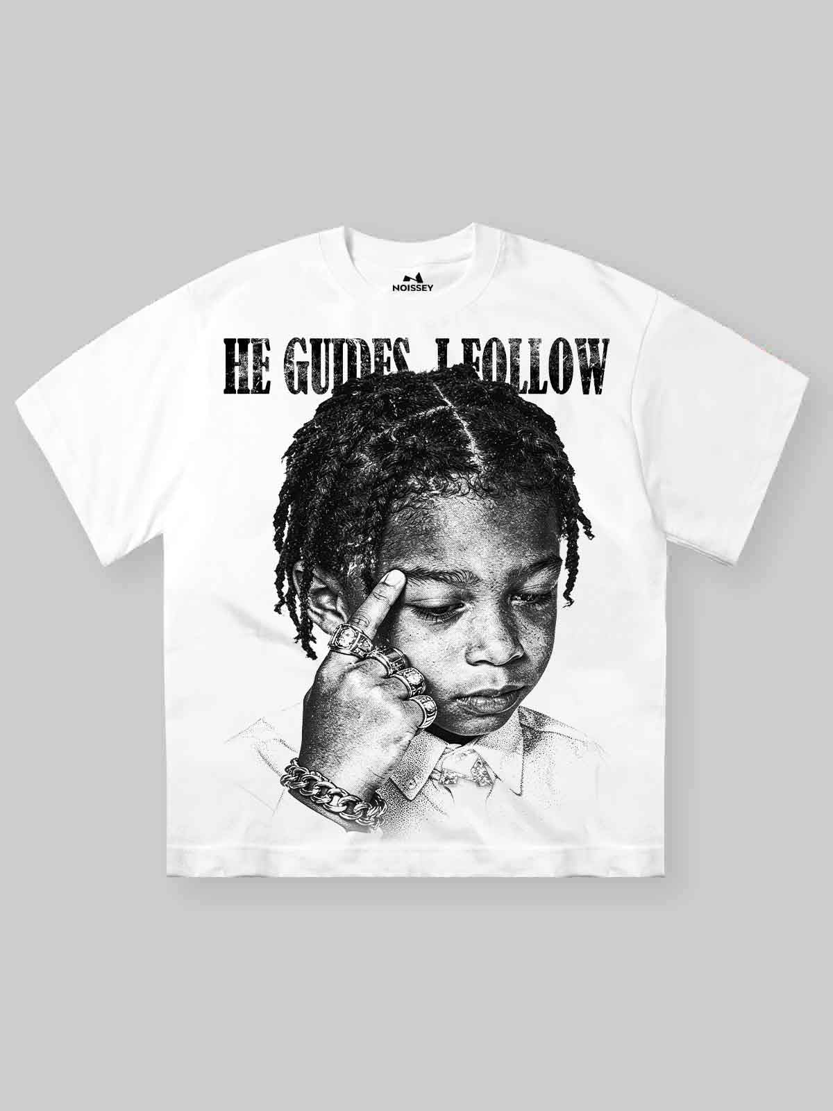 The Hook: Wisdom beyond years. This Oversized Relaxed Tee features a striking, high-contrast stipple-art graphic of a young child with dreadlocks, adorned in heavy rings and a Cuban link chain—a visual metaphor for inherited strength and spiritual guidance. Above the portrait, the "HE GUIDES I FOLLOW" manifesto is rendered in a distressed, gothic-inspired serif font, creating a powerful narrative of faith and destiny. The monochromatic black ink on a clean white canvas ensures every detail of the intricate line work pops, making this an essential statement piece for a thoughtful high-street wardrobe.
