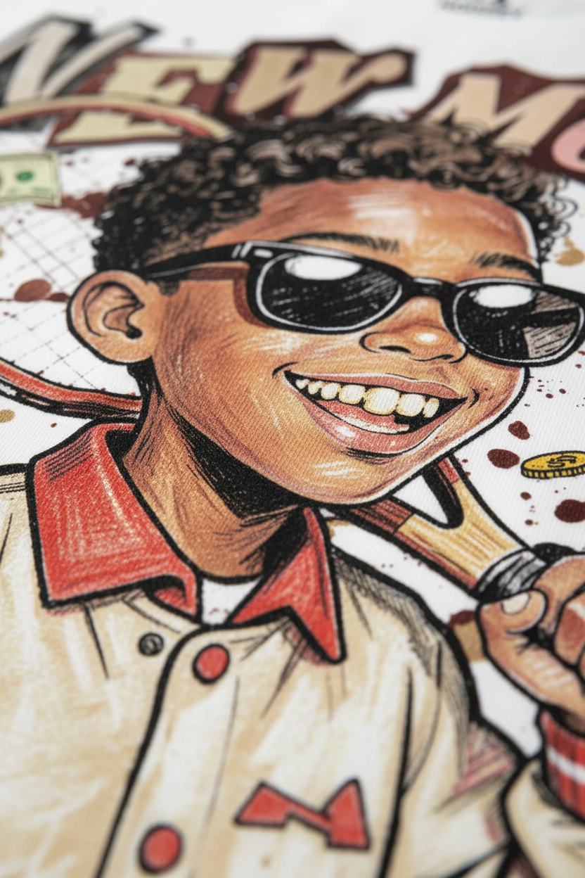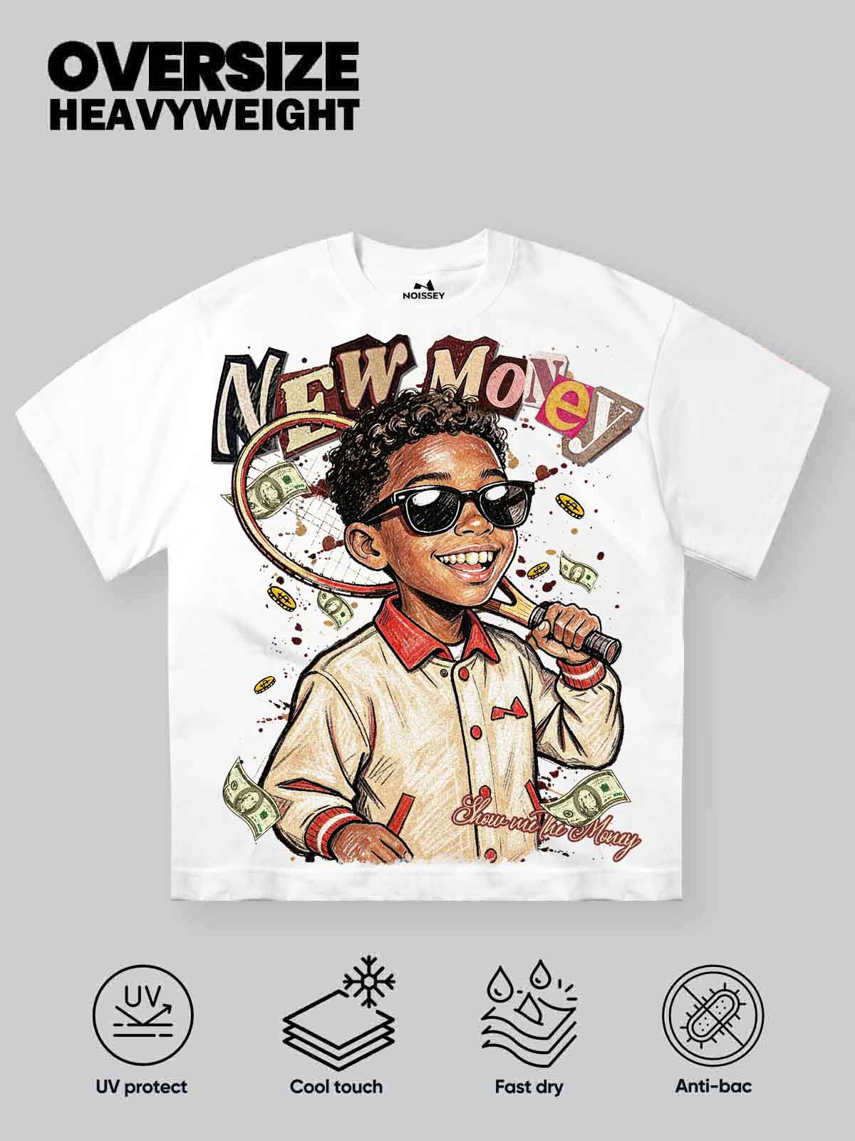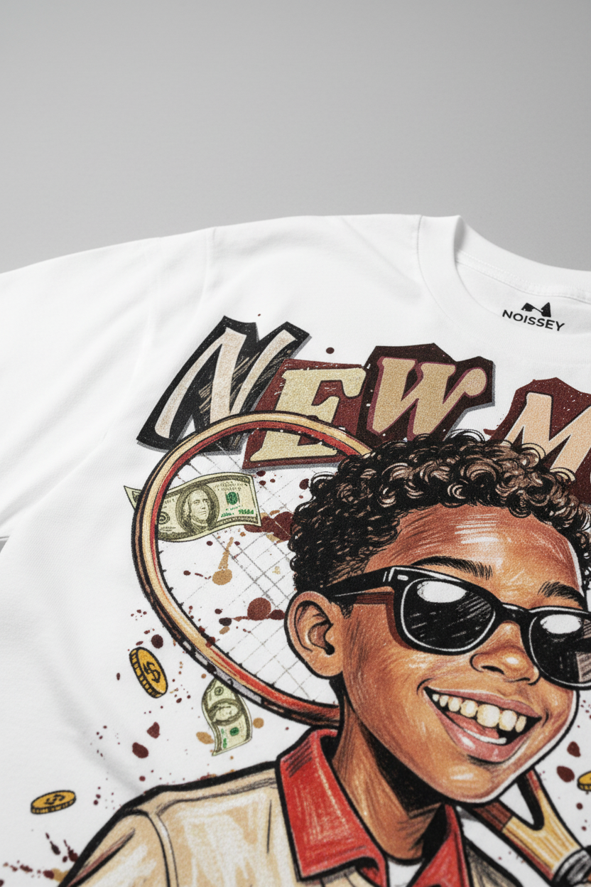 The Hook: A celebration of youth, hustle, and the modern "court" aesthetic. This premium white T-shirt features a vibrant, hand-drawn style illustration of a charismatic tennis youth, sporting a classic varsity jacket and shades. Surrounded by flying banknotes and the bold "NEW MONEY" graffiti logo, this piece captures the unapologetic energy of the next generation.